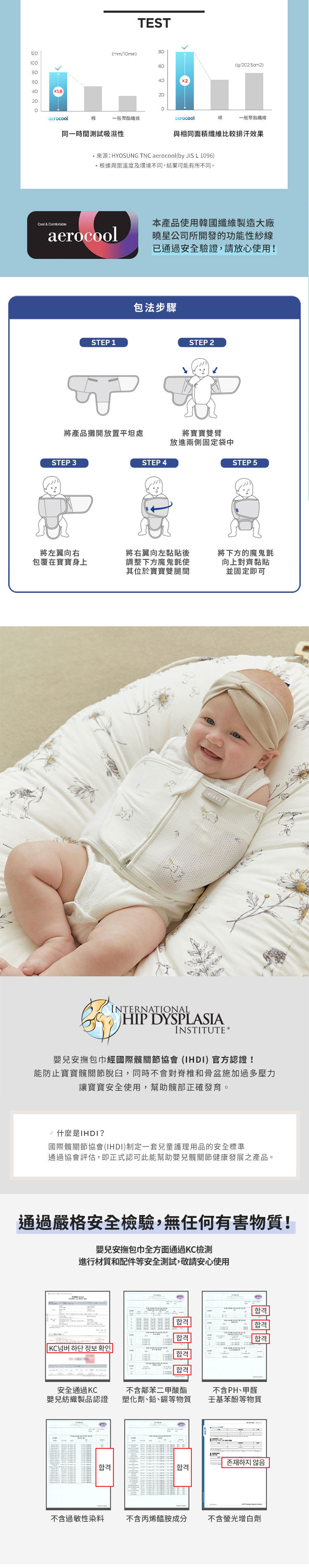 獲得國際髖關節協會(IHDI)官方認證通過協會評估,可安全使用並幫助寶寶髖部健康發展。