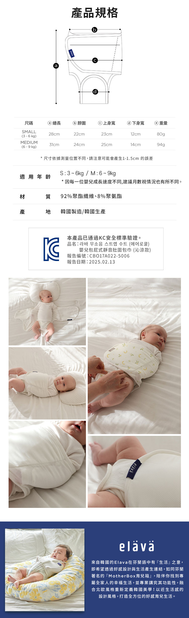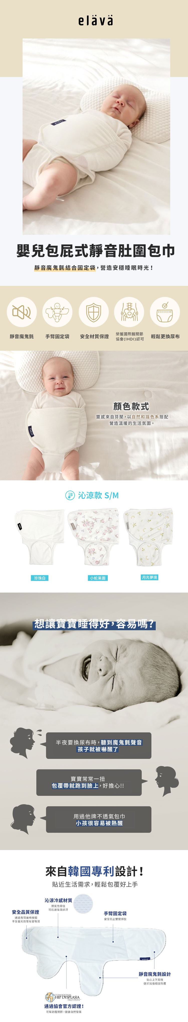 【規格說明】-品牌:Elava -品名:嬰兒包屁式靜音肚圍包巾-產地:韓國-適用年齡:S號-0~3m(3~6kg)、M號-3~6m(6~9kg)-商品尺寸:如圖所示-外包裝尺寸:21.5x33cm-商品重量:S號-80g、M號-90g-材質:92%聚酯纖維、8%聚氨酯-BSMI:M39584
