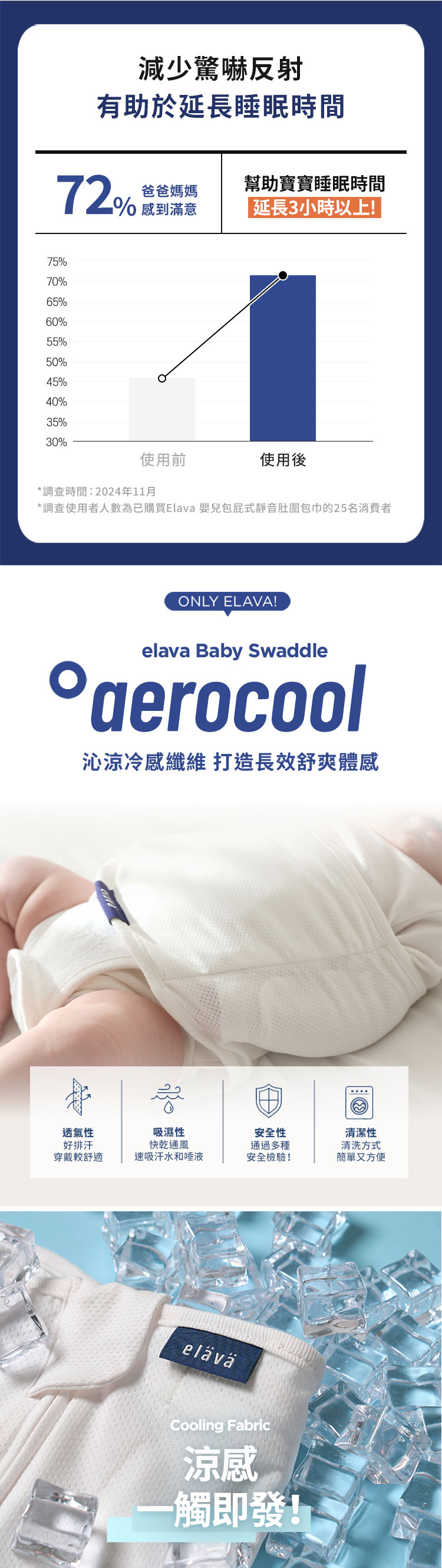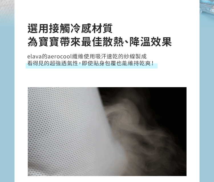 沁涼冷感材質實測出優越的吸濕性及排汗效果!打造長效舒爽體感,適合怕熱寶寶使用。