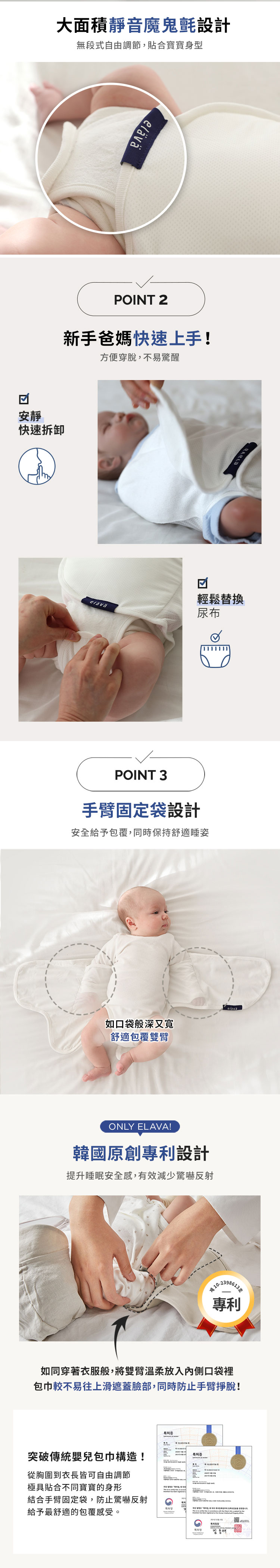 手臂固定袋設計避免雙臂掙脫,保持舒適睡姿有效安撫寶寶,減少驚嚇反射,幫助寶寶更快入睡可快速完成包覆,輕鬆更換濕尿布。