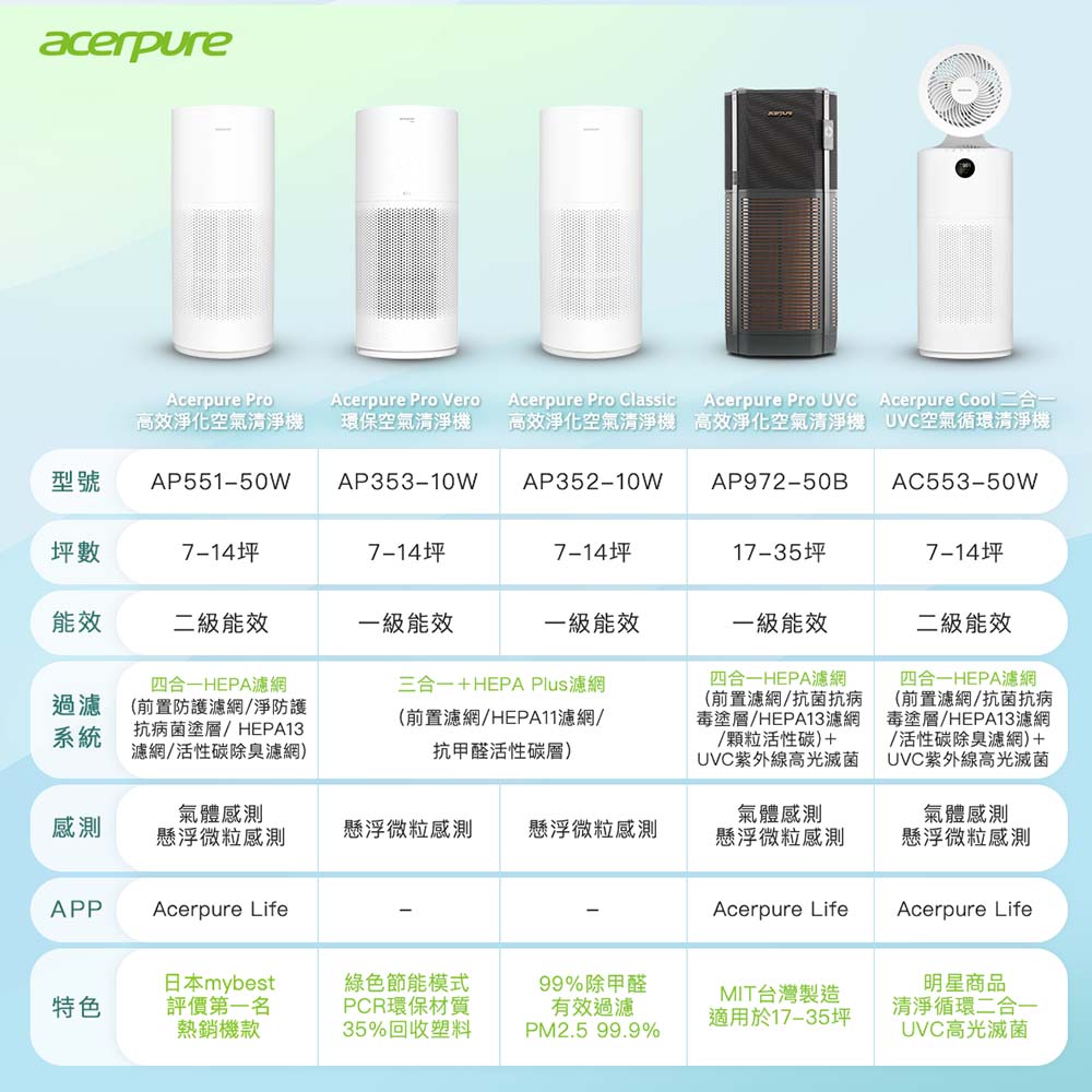 商品特色四合一HEPA濾網四層防護PLUS+ 有效對抗99%冠狀病毒 釋放千萬負離子,攔截有害物質 APP智慧遠端操作到家即淨化 智能雷射感測,自動化調節 磁吸遙控極致貼心 DC馬達低耗能高效率 適用 7-14坪 商品規格品牌:Acerpure型號:AP551-50W名稱:高效淨化空氣清淨機尺寸:WxDxH(253*253*576mm) 重量:4.22 kg 額定功率:38W CADR:324CMH 適用坪數:7-14坪 運轉音量 (最小/最大):25dB/56dB 清淨機風速:智慧/1/2/3/極強智慧感測器:氣體感測器 (VOCs)/懸浮微粒雷射感測器LCD面板顯示:空氣品質燈號/氣體感測器(VOCs)燈號/懸浮微粒數值/更換濾網指示 四合一HEPA濾網:前置防護濾網/淨防護抗病菌塗層/ HEPA13濾網/活性碳除臭濾網 WIFI遠端遙控:有 (APP支援: acerpure Life) 負離子釋放:有 兒童鎖:有 睡眠模式:有 定時:有 馬達:DC直流馬達配件:磁吸式遙控器、電源線、說明書、保證卡、遙控器電池(CR2032) BSMI:R3D814 保固期限:原廠1年 保固範圍:依原廠規定 保固來源:原廠保固◆本賣場所有商品資訊如有錯誤,實際規格與內容物請以原廠出貨標示或官網公告為準 ◆鑑賞期為猶豫期非試用期,本產品一經使用,則需負擔耗材及清潔費用,建議您訂購前請先確認評估。 ◆鑑賞期內退換貨請保持商品完整性,商品包裝需完整回收,包含購買商品、外盒、附件、內外包裝、隨機文件、贈品、商品外膜等請一併退回若有缺件、商品毀損不完整情況發生,恕無法退換貨