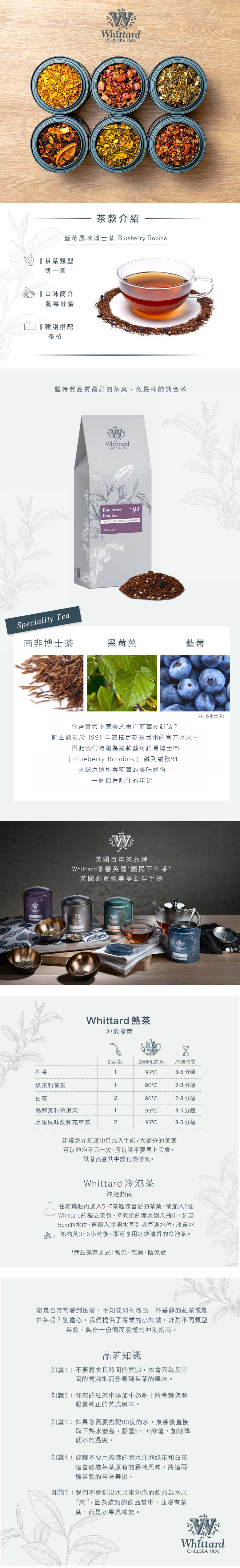 Whittard將雨林博士茶與藍莓進行完美的融合,博士茶具有蜂蜜與奶油般的香氣,與果香味的藍莓搭配得相得益彰,清新滑順的口感,散發著藍莓香氣,使味覺層次更顯完美,佐藍色矢車菊更營造出華麗的視覺效果,讓您在視覺以及味覺上,享受一場完美的英式午茶體驗。