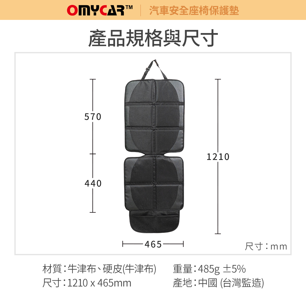 商品規格 品名:【OMyCar】汽車安全座椅保護墊材質:牛津布、硬皮(牛津布)尺寸:1210 x 465 mm ±5%重量:485g ±5%保固範圍:新品暇疵產地:中國(台灣監造)
