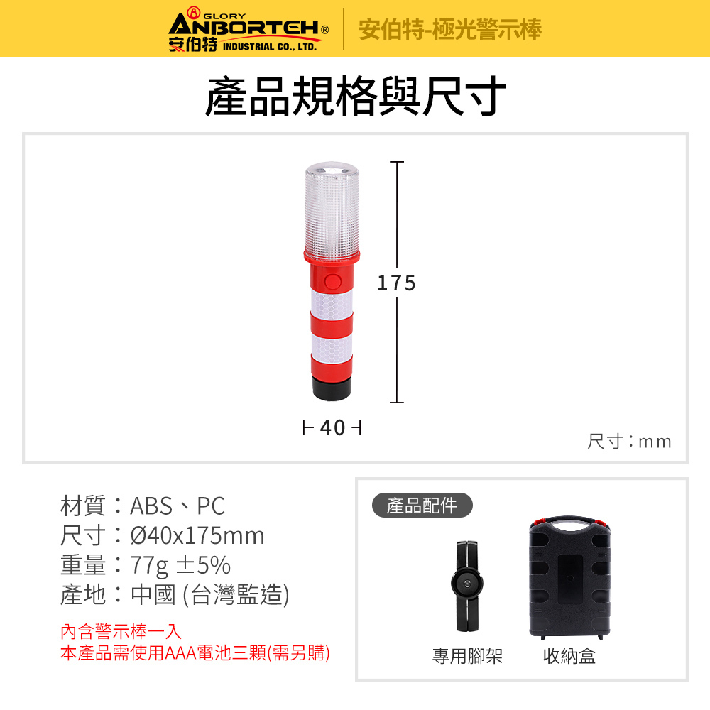商品規格商品品名:【安伯特】極光警示棒商品型號:ABT-D012供電方式:AAA (4號)電池三顆 (需另購)尺寸:40 x 175mm ±5%材質:ABS、PC重量:77g ±5%保固範圍:新品暇疵保固期限:保固一年 (非人為因素下)產地:中國 (台灣監造)