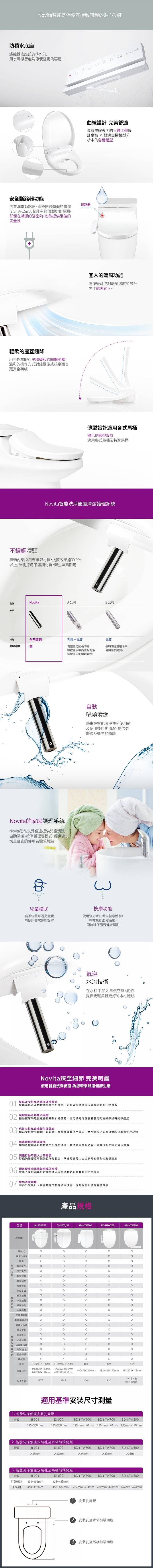 功能:除臭|暖風烘乾|暖座|噴嘴自潔|過濾水洗淨|靜音緩降便蓋|噴嘴位置控制|噴嘴水壓控制|水溫調節|女性私密洗淨|臀部洗淨|按摩洗淨|節能省電|溫度安全裝置