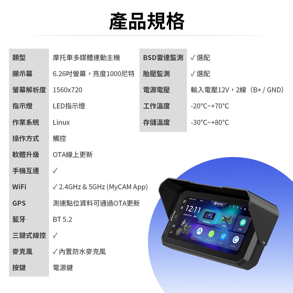 商品規格品名:【Polaroid寶麗萊】Pernis MS700C摩托車多媒體連動主機尺寸:181x93mm重量:780g ±5%NCC字號:CCAH25LP1401T5BSMI字號:R45334保固範圍:新品瑕疪(因人為因素所導致產品損壞者恕不接受保固)保固期限:保固1年產地:中國