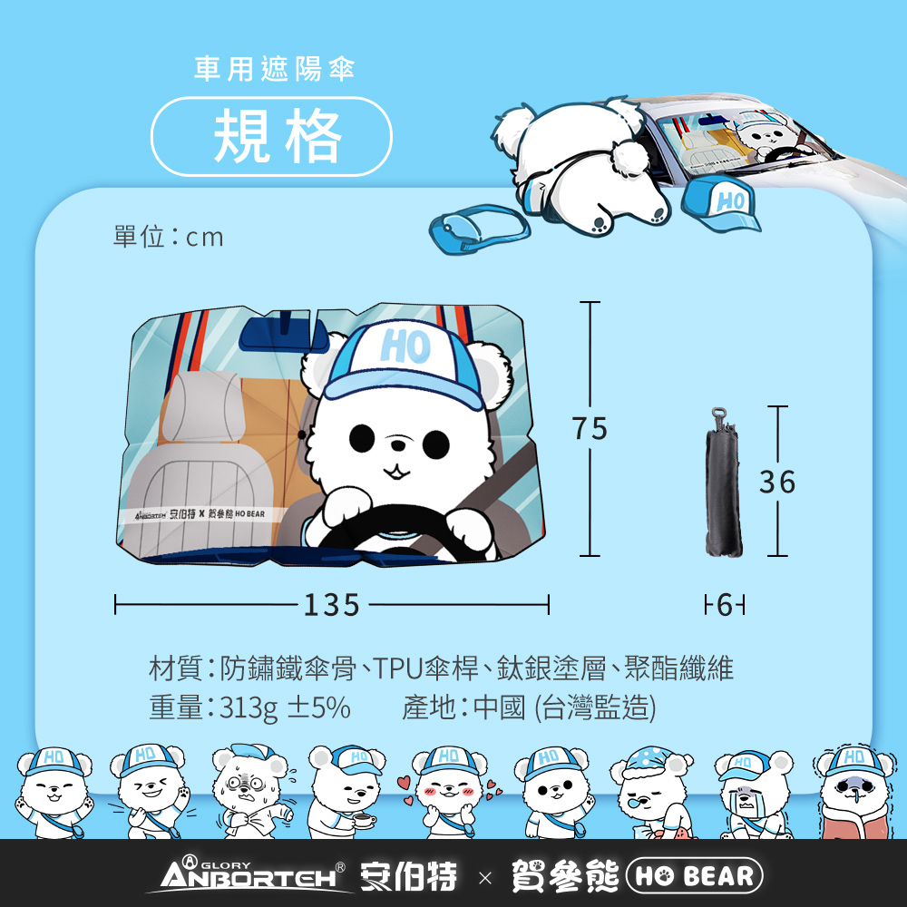 商品規格品名:【安伯特】HO Bear賀參熊車用遮陽傘型號:ABT-A228材質:防鏽鐵傘骨、TPU傘桿、鈦銀塗層、聚酯纖維收起尺寸:36x6cm ±5%展開尺寸:135x75cm ±5%重量:313g ±5%保固範圍:新品暇疵產地:中國(台灣監造)