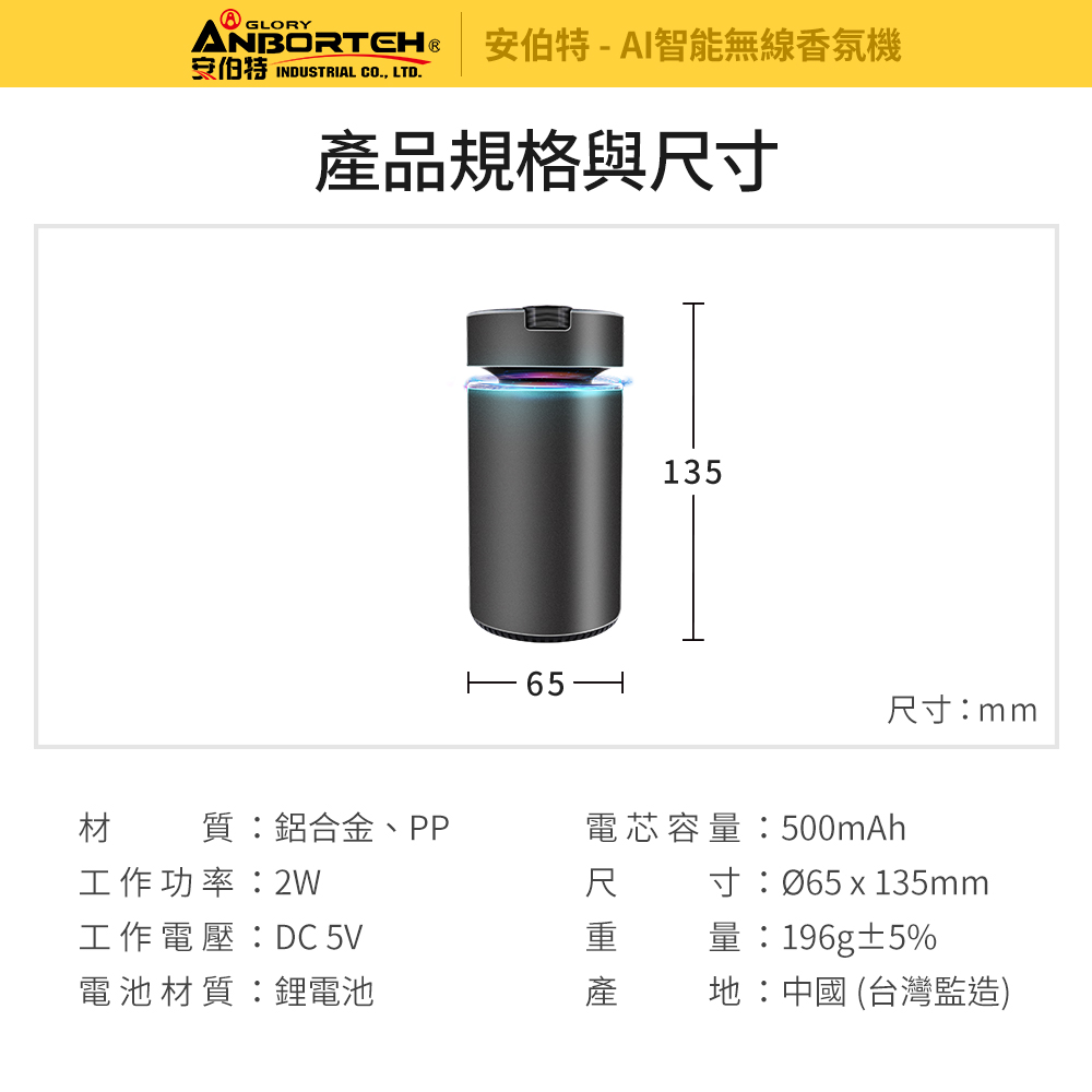 商品規格商品品名:【安伯特】AI智能無線香氛機 商品型號:ABT-E098認證字號:R3D197商品材質:鋁合金、PP工作功率:2W工作電壓:DC 5V電池材質:鋰電池電芯容量:500mAh商品重量:196g ±5%商品尺寸:65x135mm ±5%保固範圍:新品暇疵保固期限:非人為因素下,主機保固一年商品產地:中國(台灣監造)