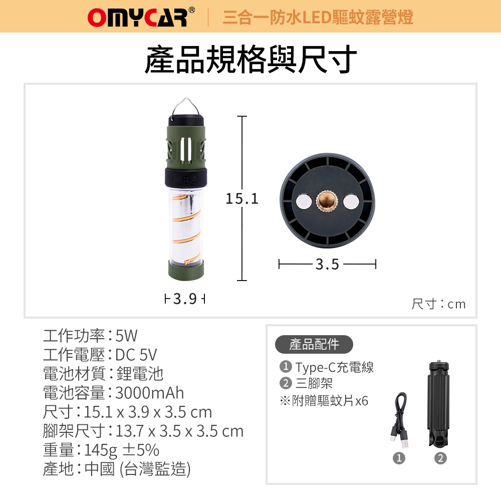 商品規格商品品名:【OMyCar】三合一防水LED驅蚊露營燈工作功率:5W工作電壓:DC 5V電池材質:鋰電池電芯容量:3000mAh商品尺寸:15.1x3.9x3.5cm ±5%腳架尺寸:13.7x3.5x3.5cm ±5%商品重量:145g ±5%保固範圍:新品暇疵保固期限:非人為因素下,主機保固一年 商品產地:中國(台灣監造)