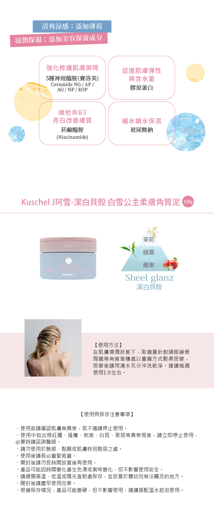 ◆商品內容名稱:Kuschel J珂雪-潔白貝殼 白雪公主柔膚角質泥120g ◆香調:茉莉、綠葉、蘋果