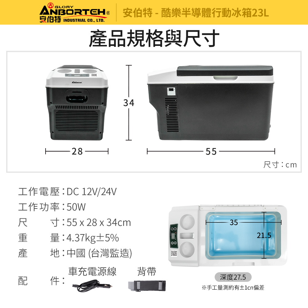 商品規格商品品名:【安伯特】酷樂半導體行動冰箱23L商品型號:ABT-E101工作功率:50W工作電壓:DC 12V / 24V儲放容量:23L製熱能力:65℃ ±5℃製冷能力:低於環境溫度25℃ ±3℃,最低2℃ ±2℃電源線長:175cm ±5cm產品材質:PP產品尺寸:55x28x34cm ±5%產品重量:4.37kg ±5%保固範圍:新品暇疵保固期限:主機保固一年(非人為因素下)產地:中國(台灣監造)