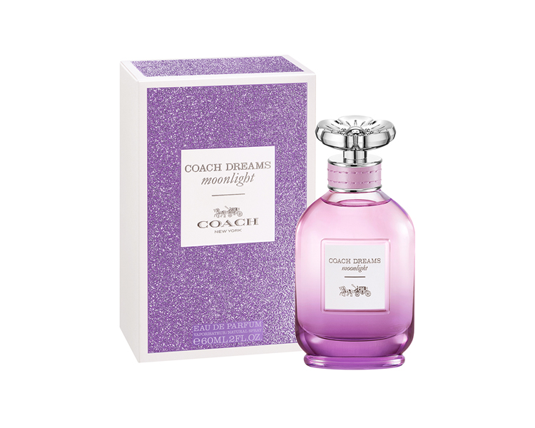 COACH DREAMS moonlight逐夢月光淡香精採用宛如復古藥瓶的外型設計,搭配紫色漸層玻璃,呼應著COACH近年愛用的色彩,也展現彷彿夜幕逐漸降下的迷人景色。明月般的銀色瓶蓋維持COACH 香氛一貫的無瓶蓋設計,使用深具代表性的茶玫瑰做為噴頭,瓶蓋下鑲嵌著COACH精湛的皮革工藝細節。外盒維持著逐夢系列的閃耀金蔥盒身,搭配與香水同色系的紫色金蔥,讓人想起夢想的魅力。