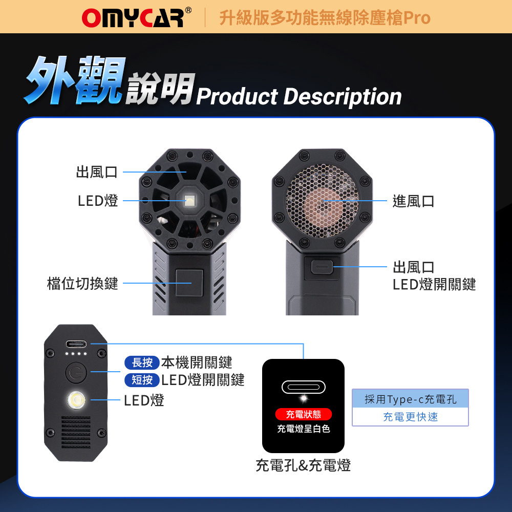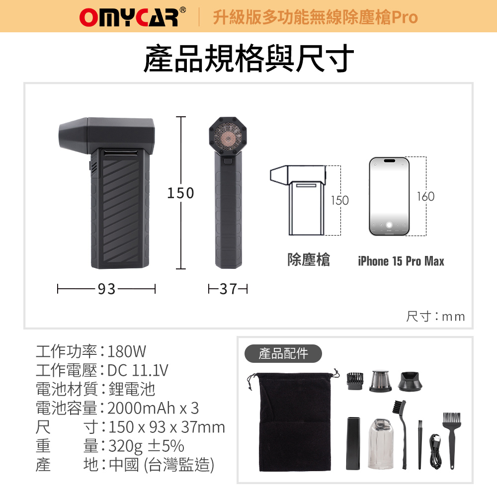 商品規格商品品名:【OMyCar】升級版多功能無線除塵槍Pro認證字號:R3D197工作功率:180W工作電壓:DC 11.1V電池材質:鋰電池電池容量:2000mAh x3商品重量:320g ±5%保固範圍:新品暇疵保固期限:非人為因素下,主機保固一年商品產地:中國(台灣監造)