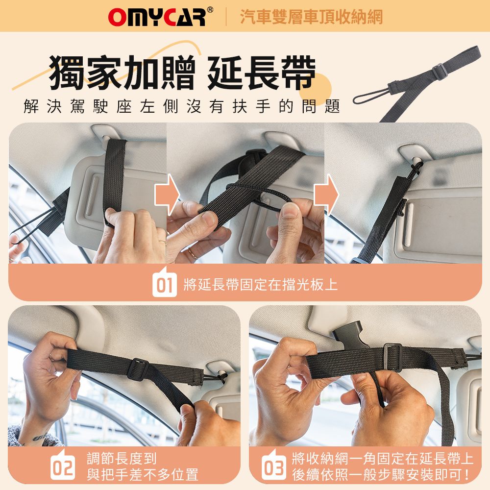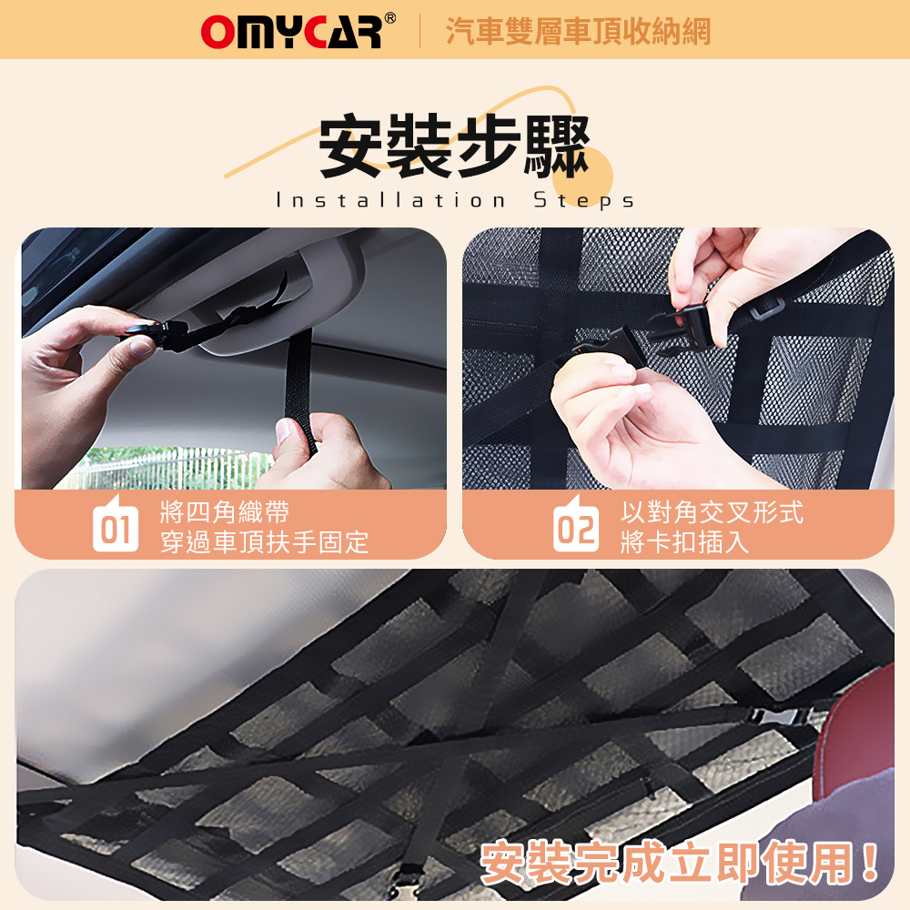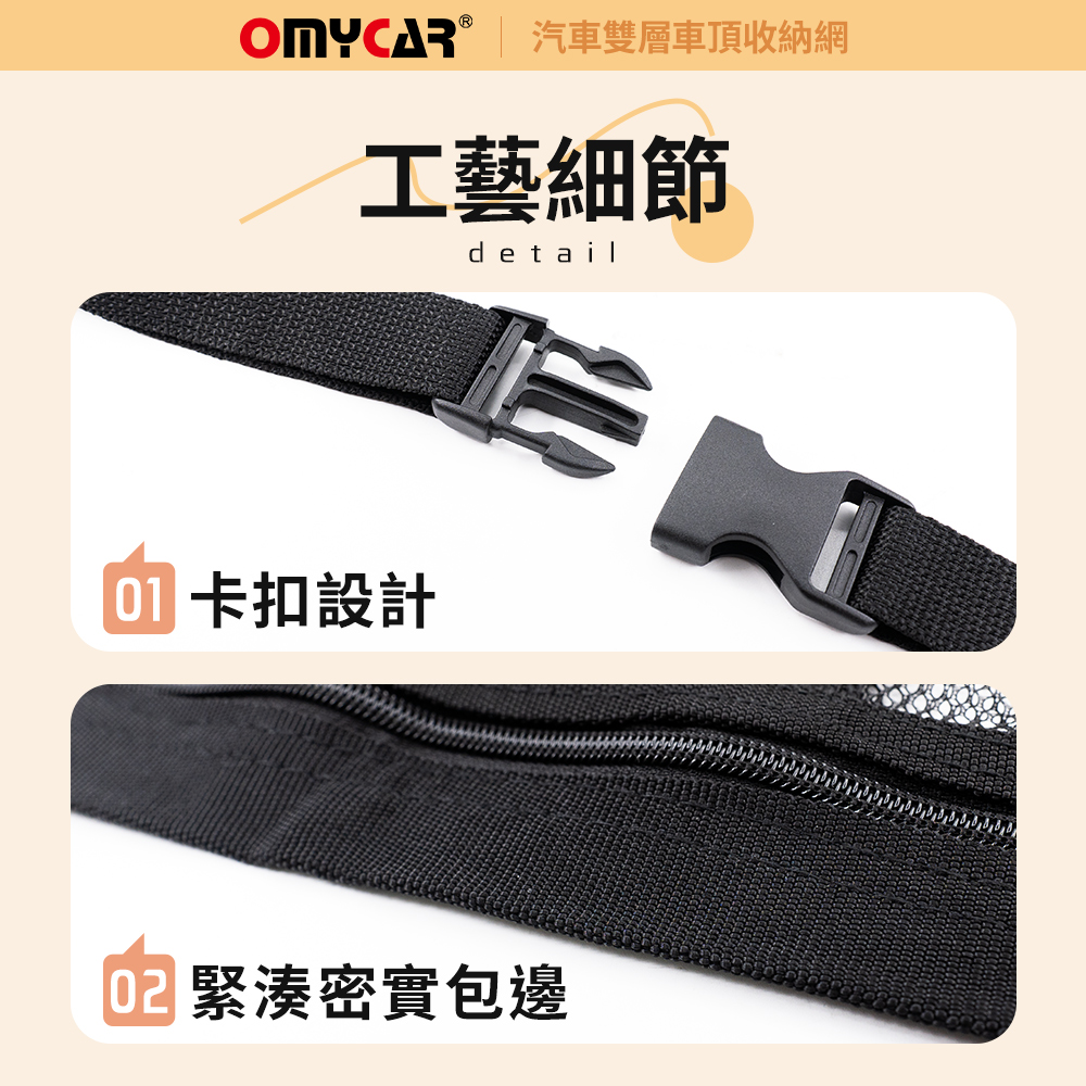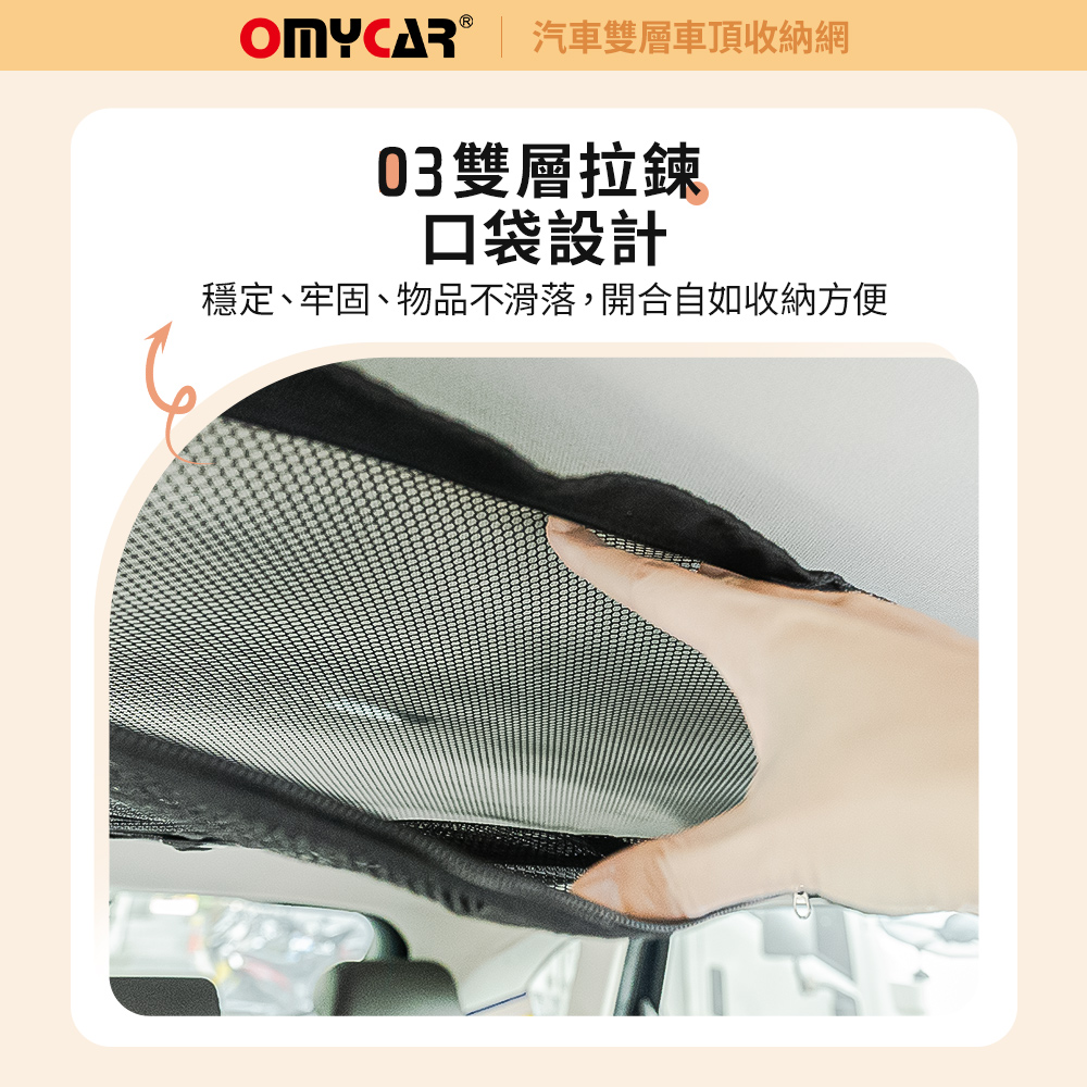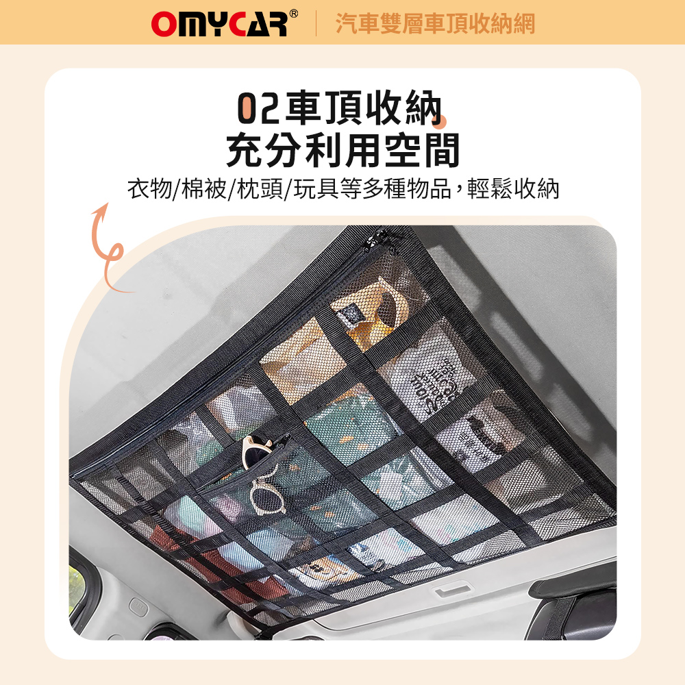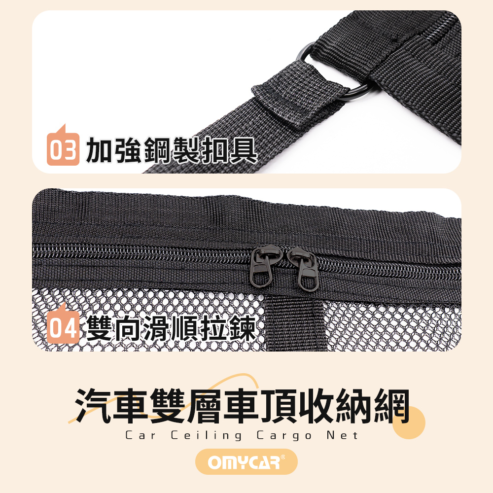大容量收納,妥善利用車頂空間雙層拉鍊設計,穩定、牢固,物品不掉落透明網袋設計,物品一目了然,拿取方便