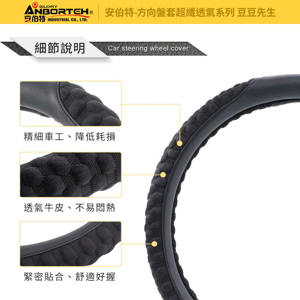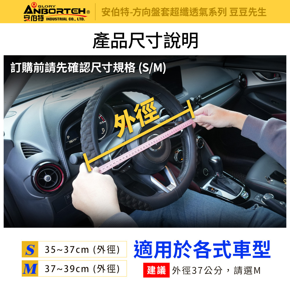 商品規格品名:【安伯特】超纖透氣方向盤套(豆豆先生)型號:ABT-A221材質:皮革、聚酯纖維、橡膠尺寸:S(35~37cm)、M(37~39cm)重量:525g ±5%保固範圍:新品暇疵產地:中國(台灣監造)