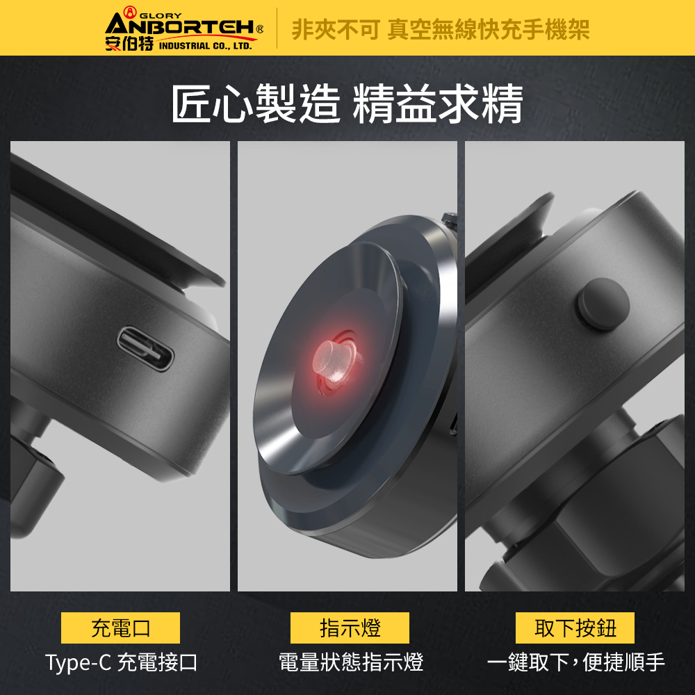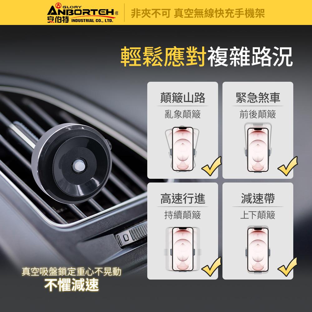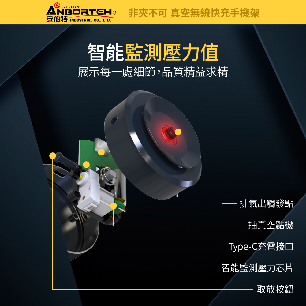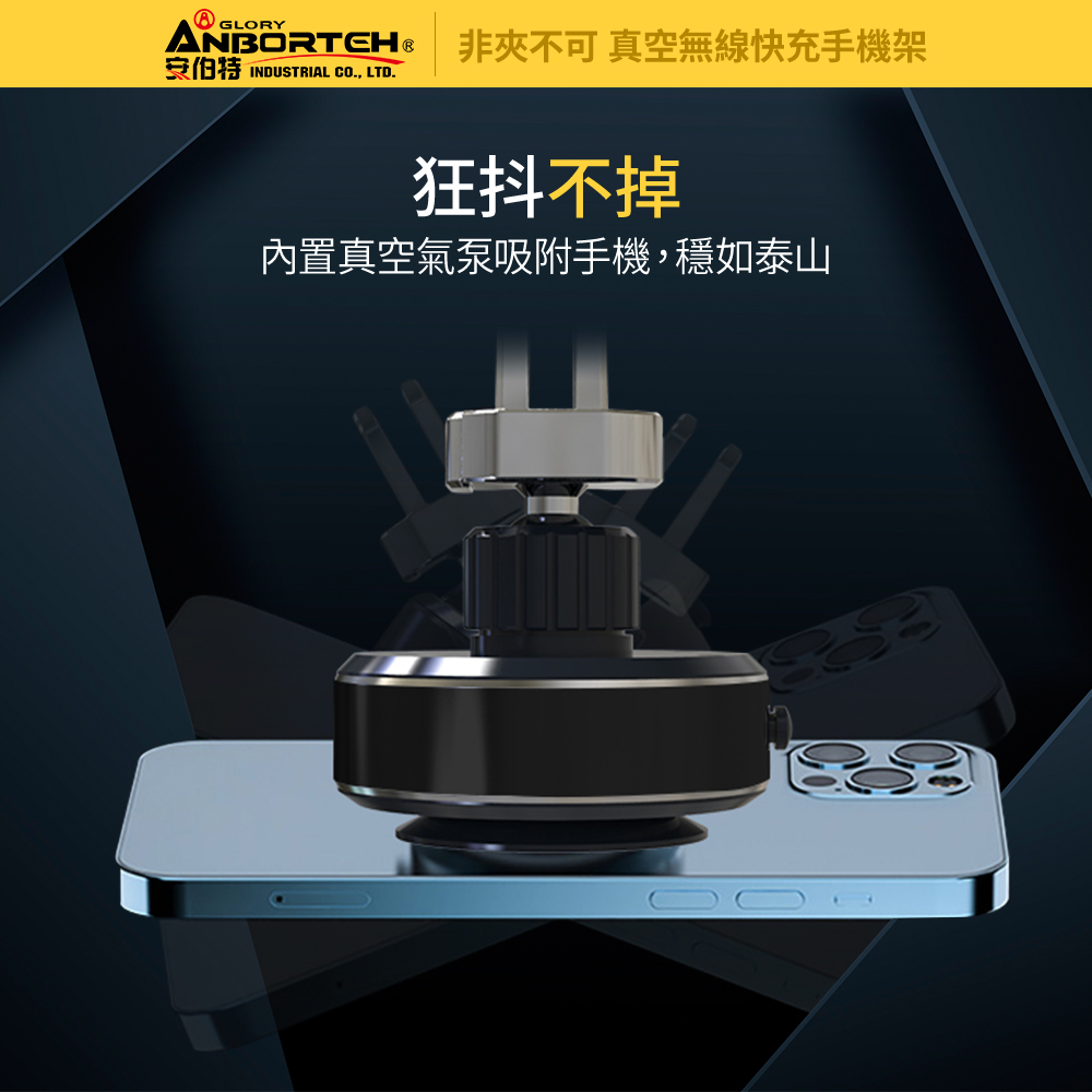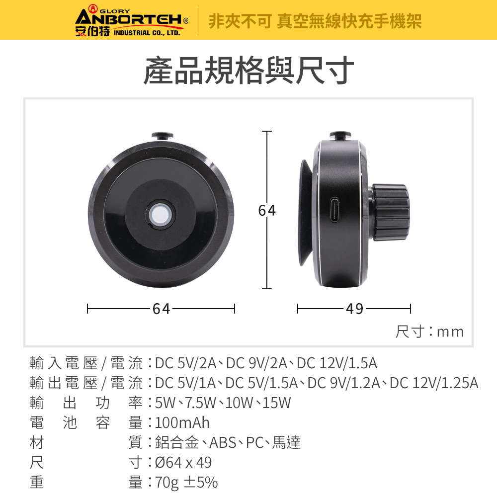 商品規格品名:【安伯特】真空無線快充手機架型號:ABT-A211BSMI認證字號:R3D197NCC字號:CCAH24LPA910T5材質:鋁合金、ABS、PC、馬達尺寸:64x49mm ±5%重量:70g ±5%保固範圍:新品暇疵保固期限:非人為因素下,主體保固一年產地:中國(台灣監造)