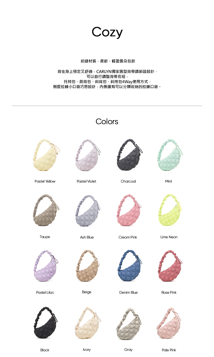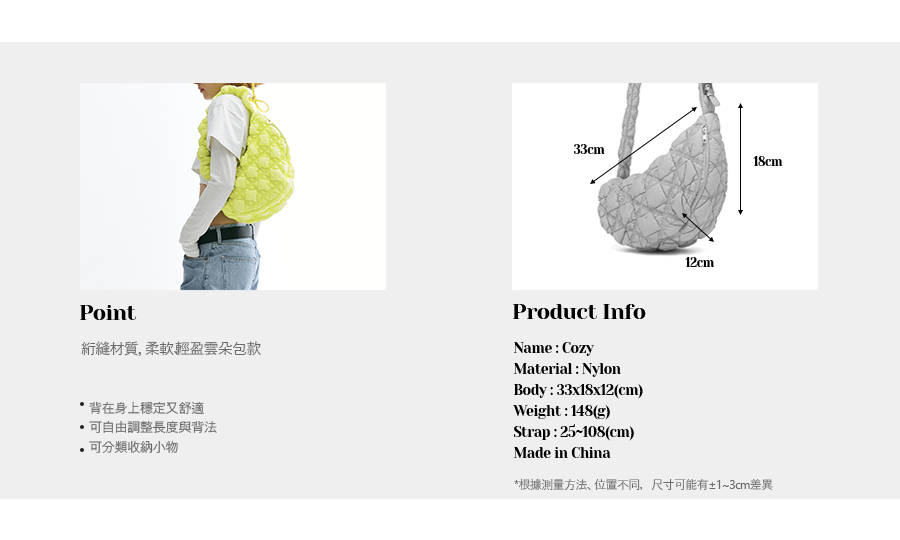 背帶設計:採用抽繩式伸縮設計,可依照每天不同穿搭風格靈活調整長度。