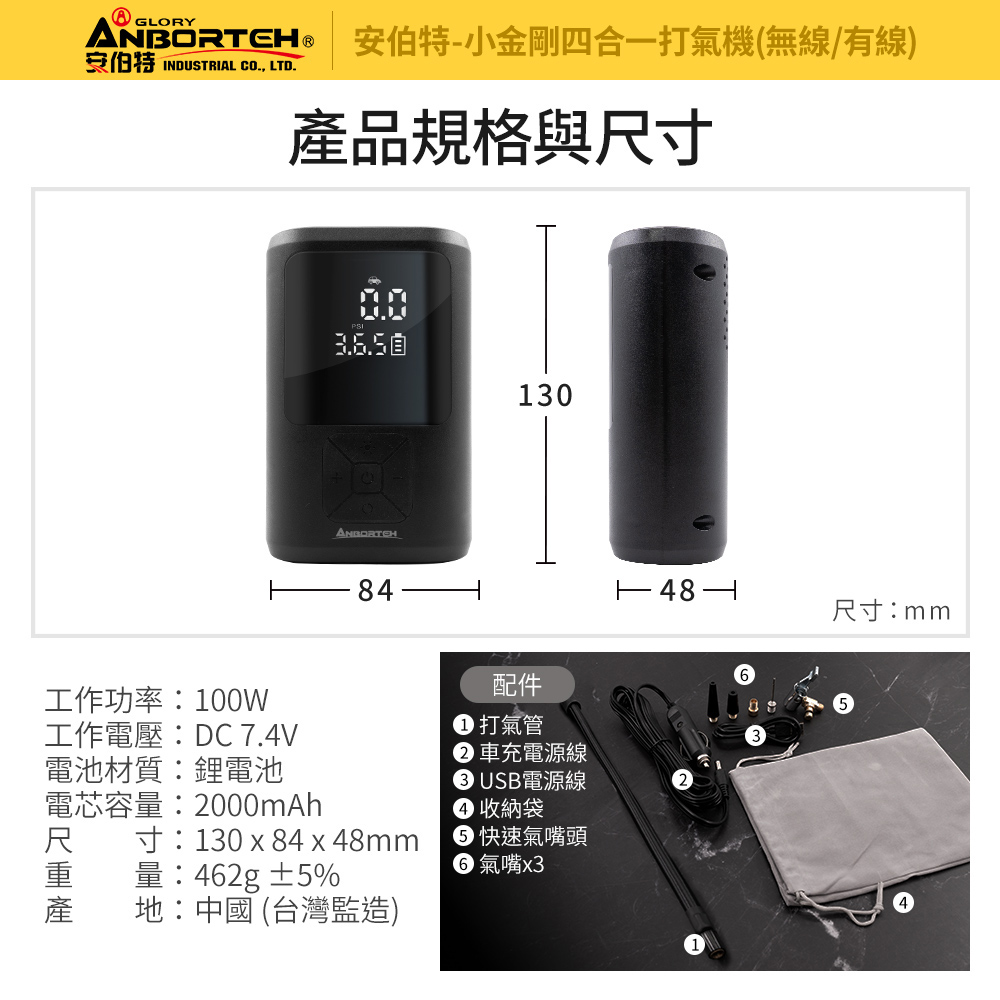 商品規格商品品名:【安伯特】小金剛四合一打氣機BSMI認證字號:R3D197商品型號:ABT-D010工作功率:100W工作電壓:DC 7.4V電池材質:鋰電池電芯容量:2000mAh商品尺寸:130x84x48mm ±5%商品重量:462g ±5%保固範圍:新品暇疵保固期限:主體保固一年,耗材保固三個月(非人為因素下)商品產地:中國(台灣監造)