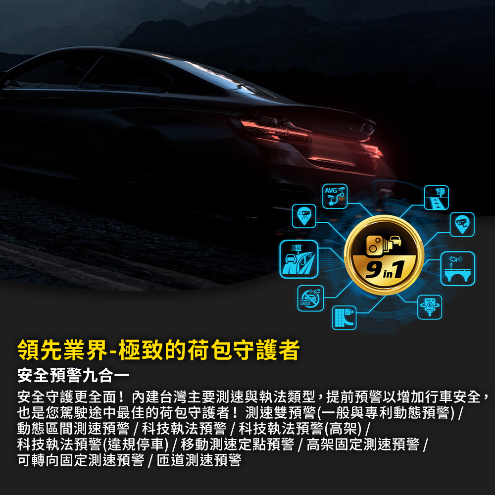 ★前後4K+2K超高清同步錄影★採用Sony的星光級感光元件★內建WIFI無線更新測速點★安全預警九合一★SuperMP4格式以秒寫入無壞檔★專利動態固定測速預警★動態區間測速預警★科技執法預警★科技執法預警 (高架)★科技執法預警 (違規停車)★可轉向固定測速預警★移動測速定點預警★高架固定測速預警★匝道測速預警★智能二合一駐車模式(全時/省電)*需選購電力線