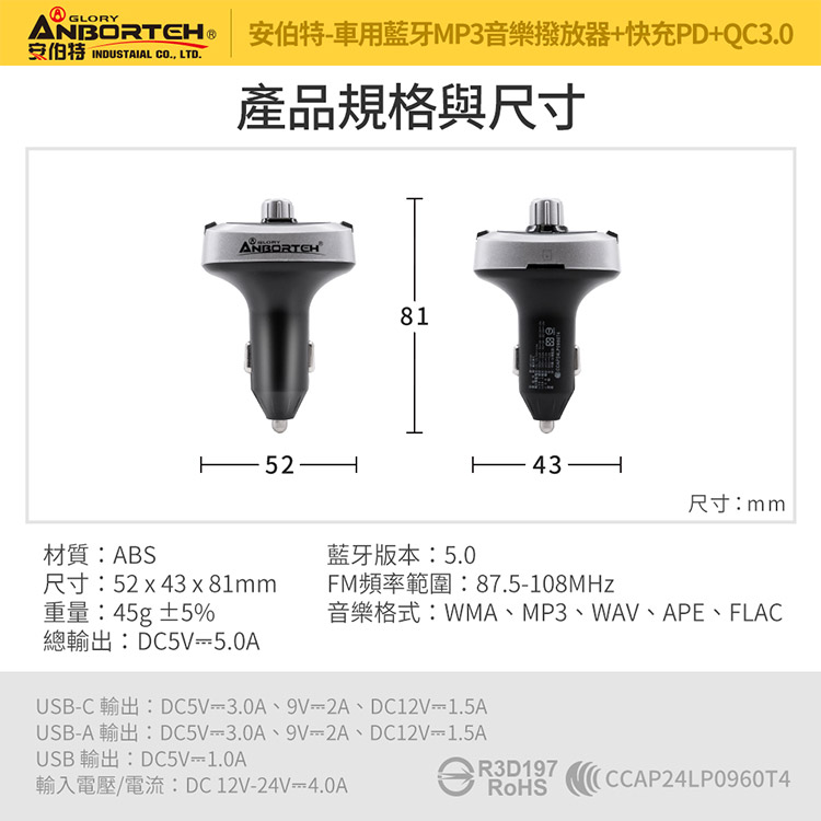 國家認證 :BSMI國家認證 R3D197 RoHsNCC認證:CCAP24LP0960T4高速輸出:PD、QC高速輸出,快充效果不打折智能晶片:過電流保護、過熱保護、過電壓保護、短路保護藍牙5.0:高清音質、穩定輸出、增強信號適用範圍:12V/24V大小客貨車輛皆可使用