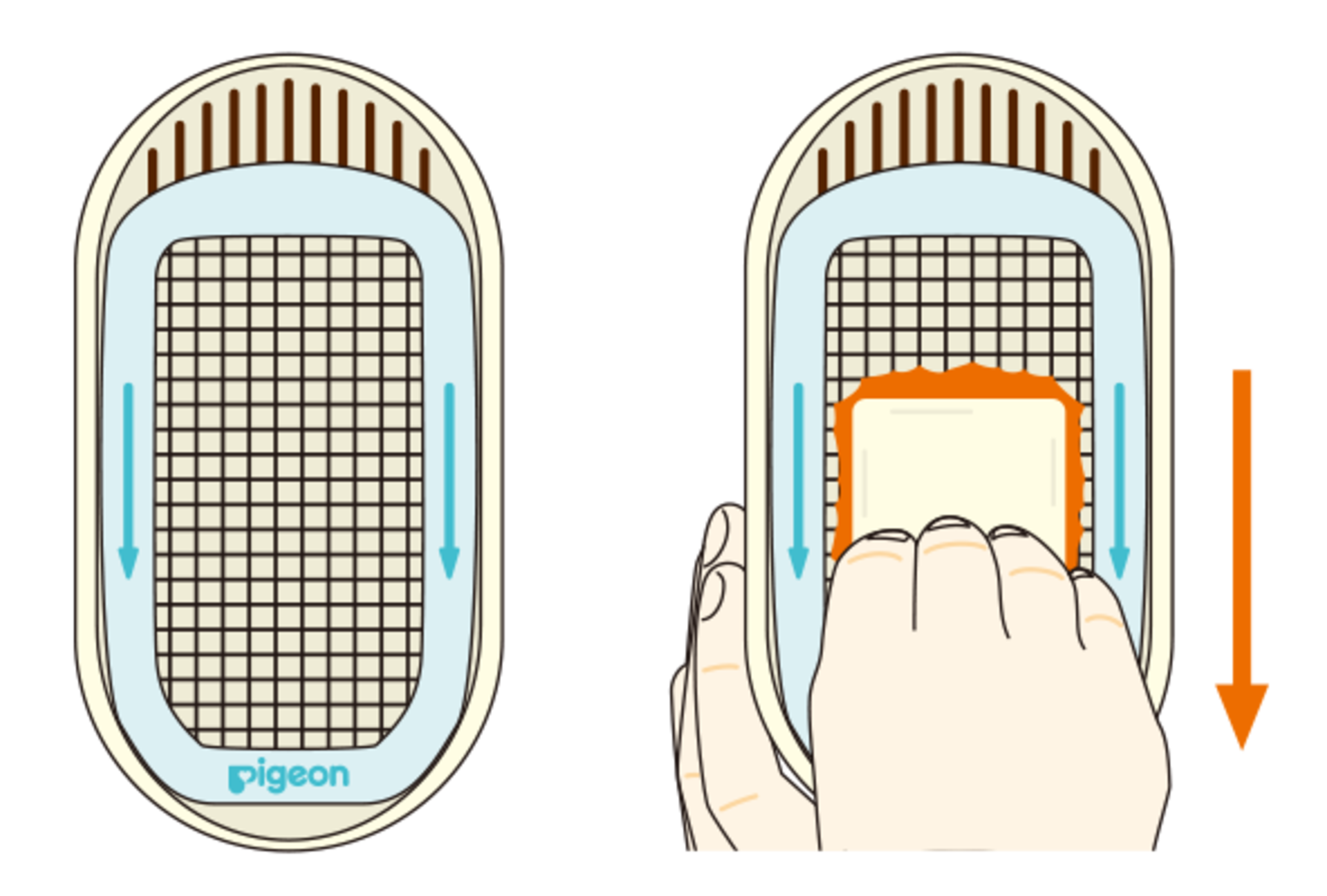如外盒背面圖示,濾網放置方向請將Pigeon Logo放在較靠近身體的位置,再運用研磨板沿圖示箭頭(往Pigeon Logo方向)方向,將食物壓碎。