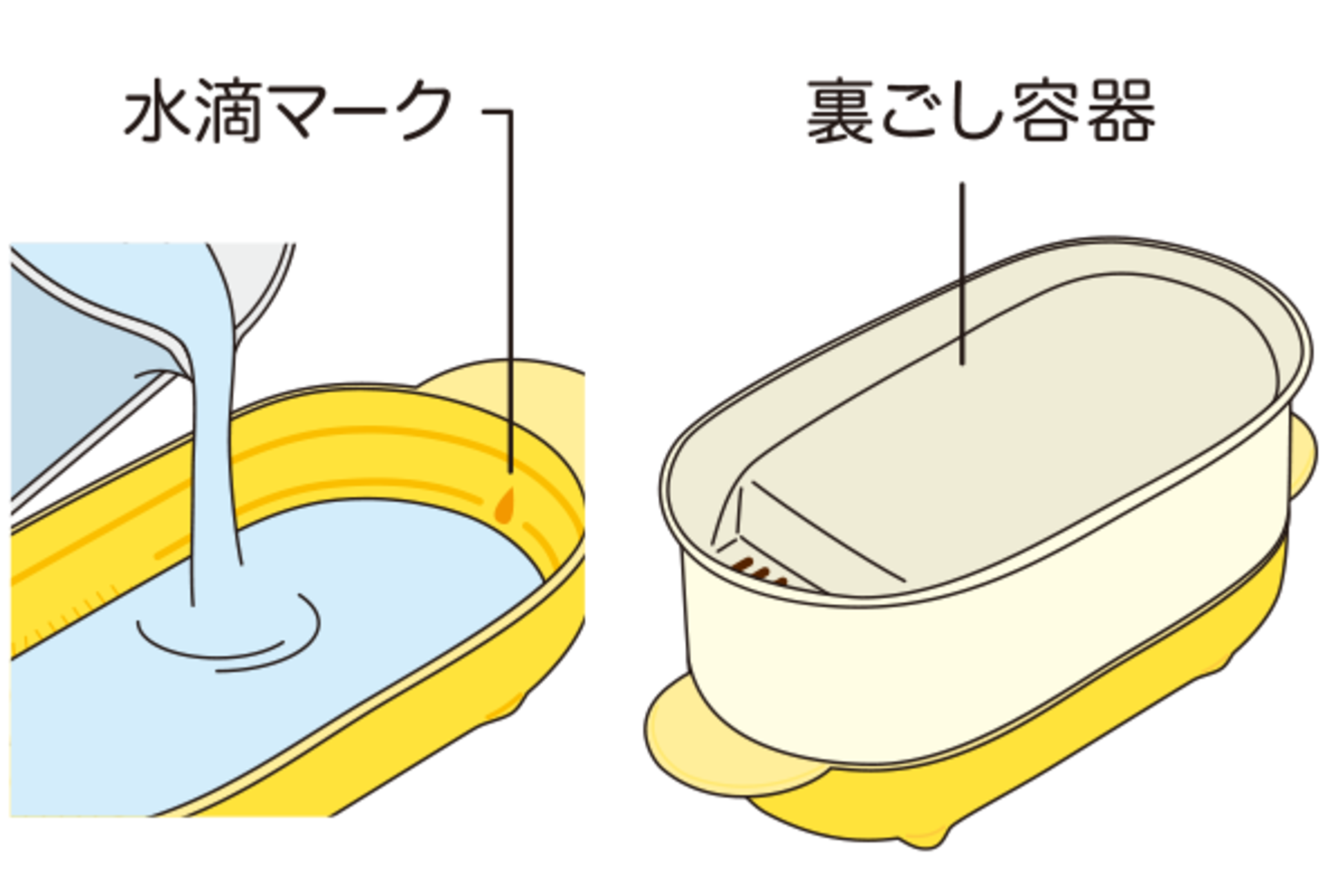 2. 將水倒入調理粥容器至”水滴Mark”標線處,將過篩食物容器反過來放在調理粥容器上作為蓋子。