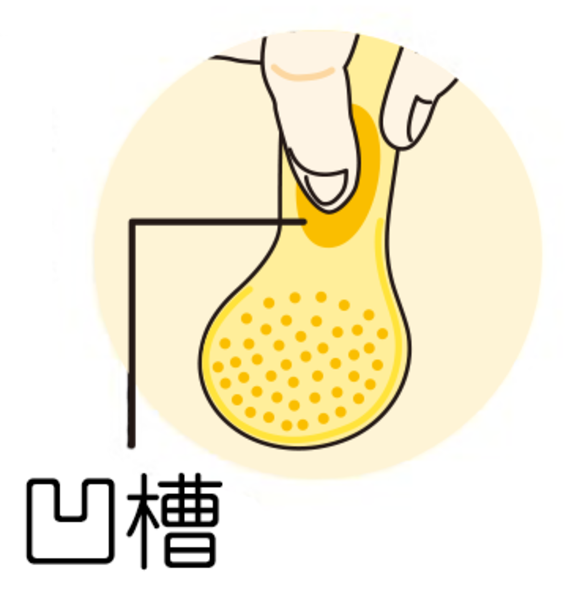 ★小訣竅:請將食指放在湯匙的凹槽處,因湯匙凹槽設計與食指相合,很容易施力,且湯匙底部有充分的凹凸設計,可輕鬆截取食物、將其磨碎。