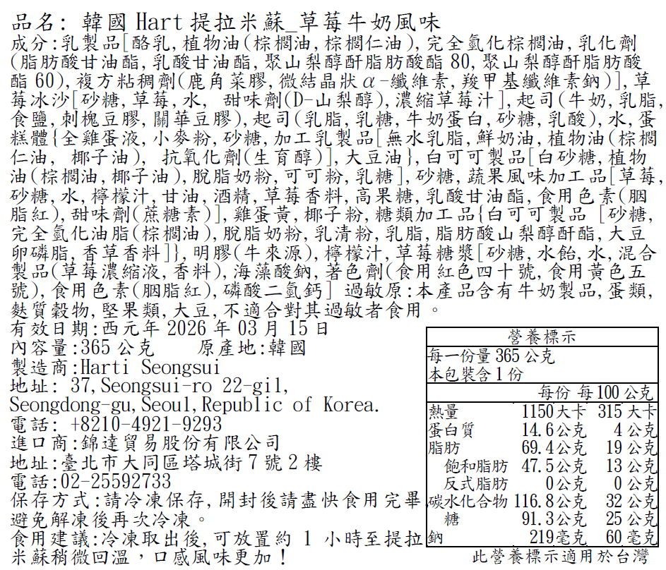 品名:韓國 Hart 提拉米蘇 _草莓牛奶