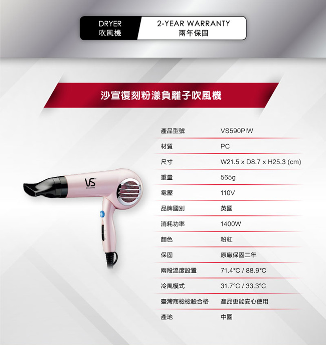 ◆型號:VS590PIW◆材質:PC◆額定電壓/頻率:110V/60Hz◆消耗功率:1400W◆尺寸:寬21.5x深8.7x高25.3(cm)◆重量:565g◆產地:中國◆國際條碼:4892684012211◆保固:原廠保固2年