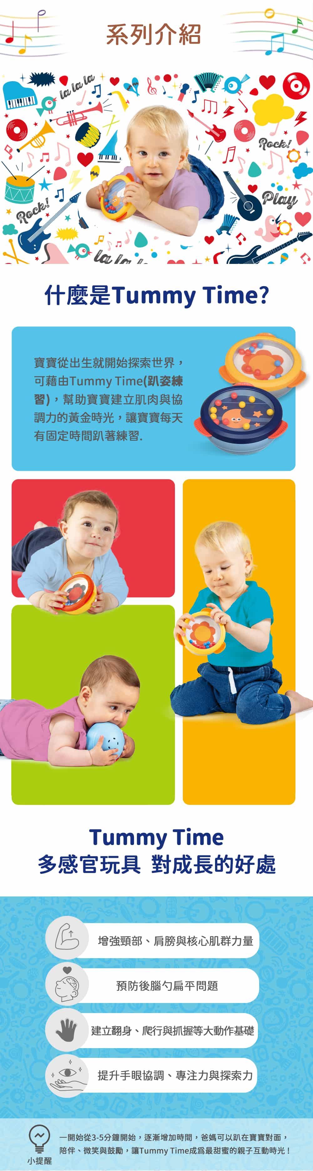 【關於 Tummy Time 趴玩時間】Tummy Time 是寶寶成長過程中非常重要的練習,有助於訓練頸部、肩膀與背部肌肉,為翻身、爬行等動作打下良好基礎,同時也能預防長時間仰躺造成的頭型扁平問題。