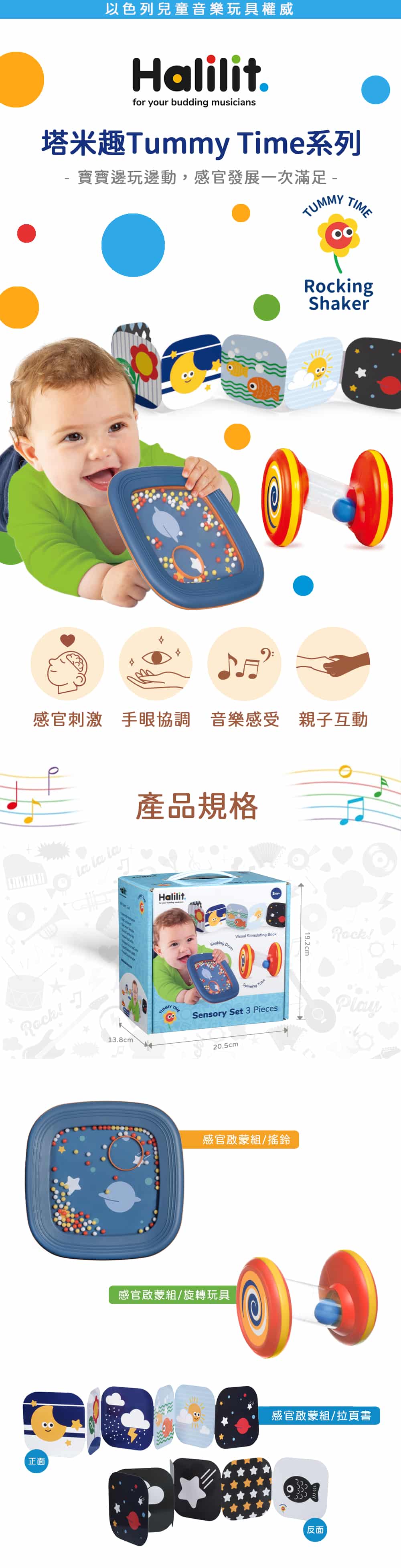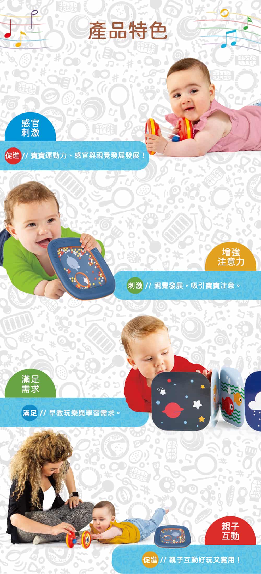 專為寶寶趴玩時期設計,結合搖鼓、旋轉玩具與視覺刺激書