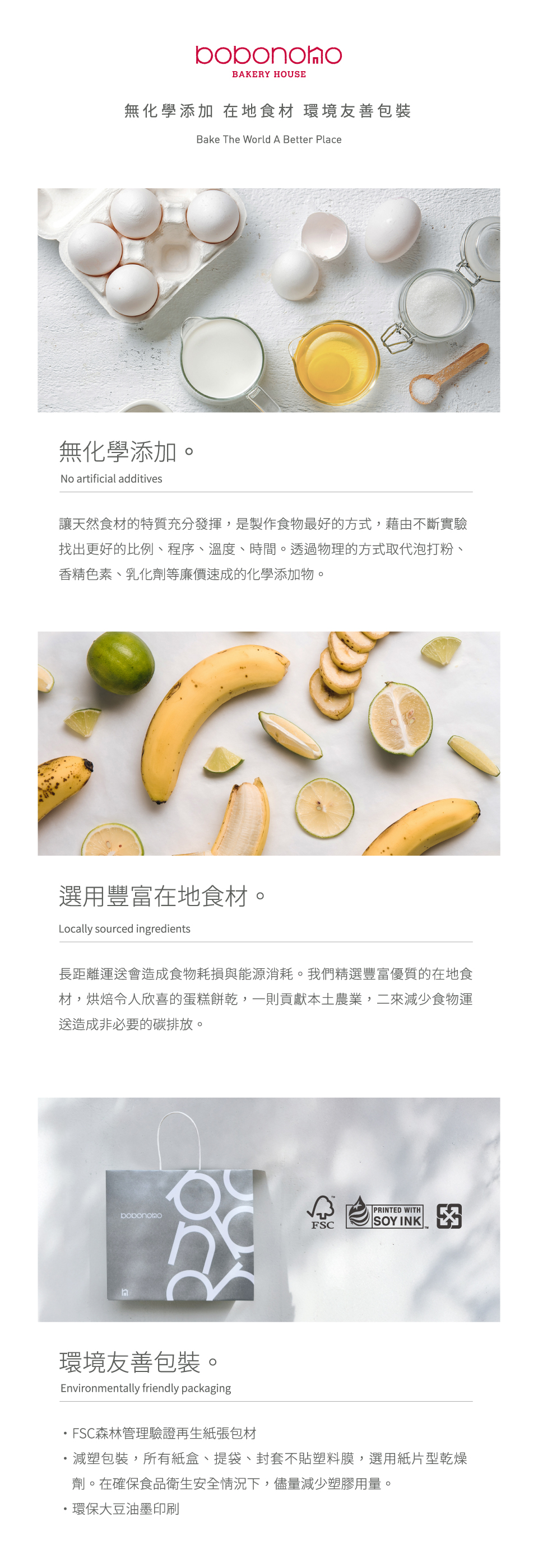 內 容 | 蛋糕共6片口 味 | 蜜柚包種、草莓奶油,各2片。摩卡可可風味、鐵觀音芝麻,各1片。外盒尺寸 | 長23 x 寬21.5 x 高5 公分,附提袋。提袋尺寸 | 面寬28 x 高25 x 底寬9 公分。素 食 | 蛋奶素可食用。過敏原 | 品項皆含麩質穀物(麵粉)、乳製品、雞蛋及堅果,摩卡可可含大豆風味,鐵觀音芝麻含芝麻。