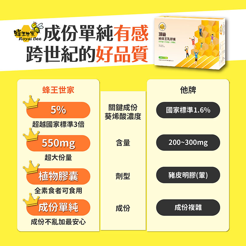 《蜂王乳膠囊不同於生鮮蜂王乳之處 》1.經過高濃度濃縮,蜂王乳中的葵烯酸約為生鮮的三倍,幫助加倍!2.由北美松樹皮萃取的天然透明膠質,製成植物性膠囊(全素),吃的安心最重要!3.由於蜂王乳含有典型的酚與酸氣味(較為刺鼻),口感酸澀略帶辛辣,不習慣的人可選擇膠囊,方便食用。4.外出、出國攜帶方便。