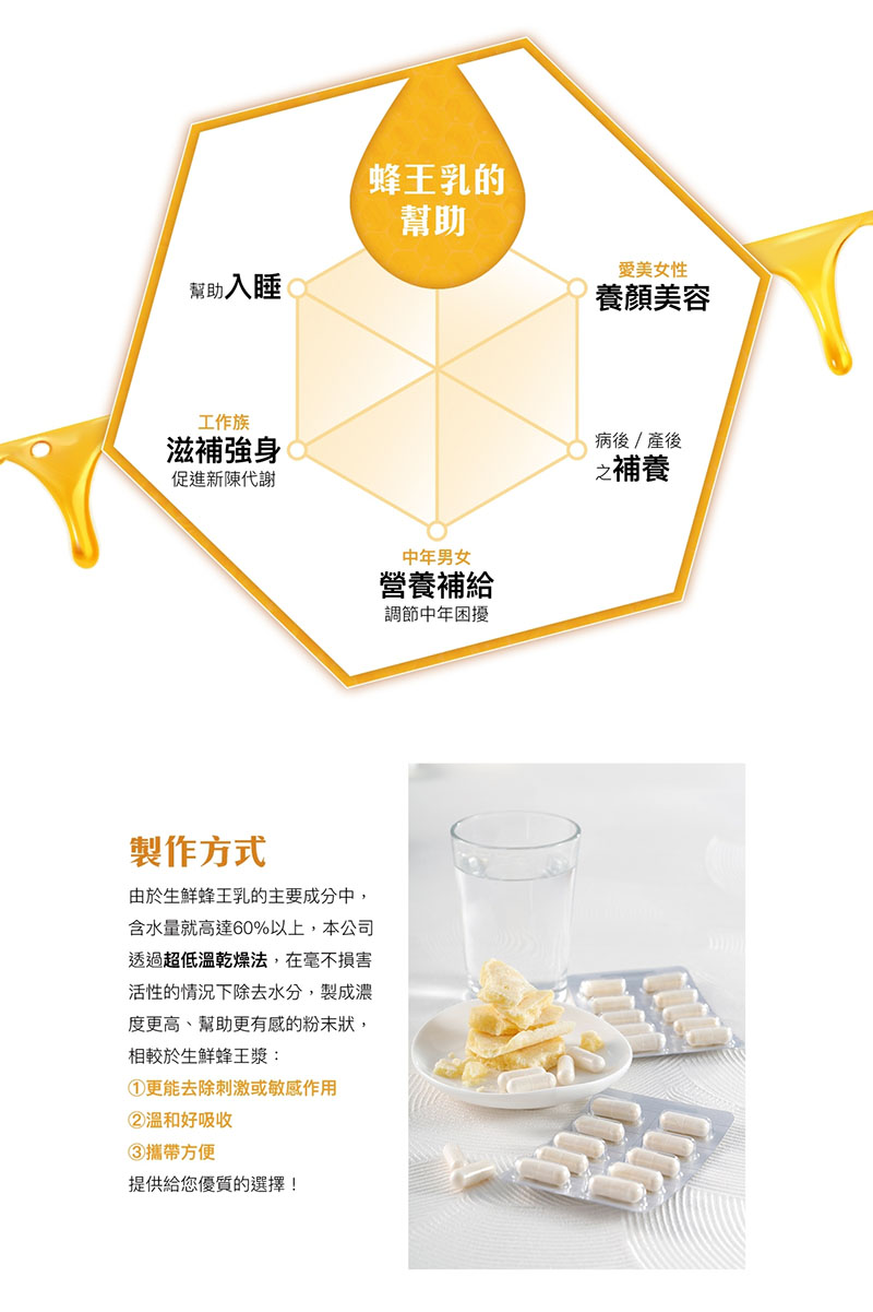 《製作方式 》由於生鮮蜂王乳的主要成分中,含水量就高達60%以上,本公司透過超低溫乾燥法,在毫不損害活性的情況下除去水分,製成濃度更高、幫助更有感的粉末狀,相較於生鮮蜂王漿更能去除刺激或敏感作用,溫和好吸收、攜帶方便,提供給您優質的選擇。
