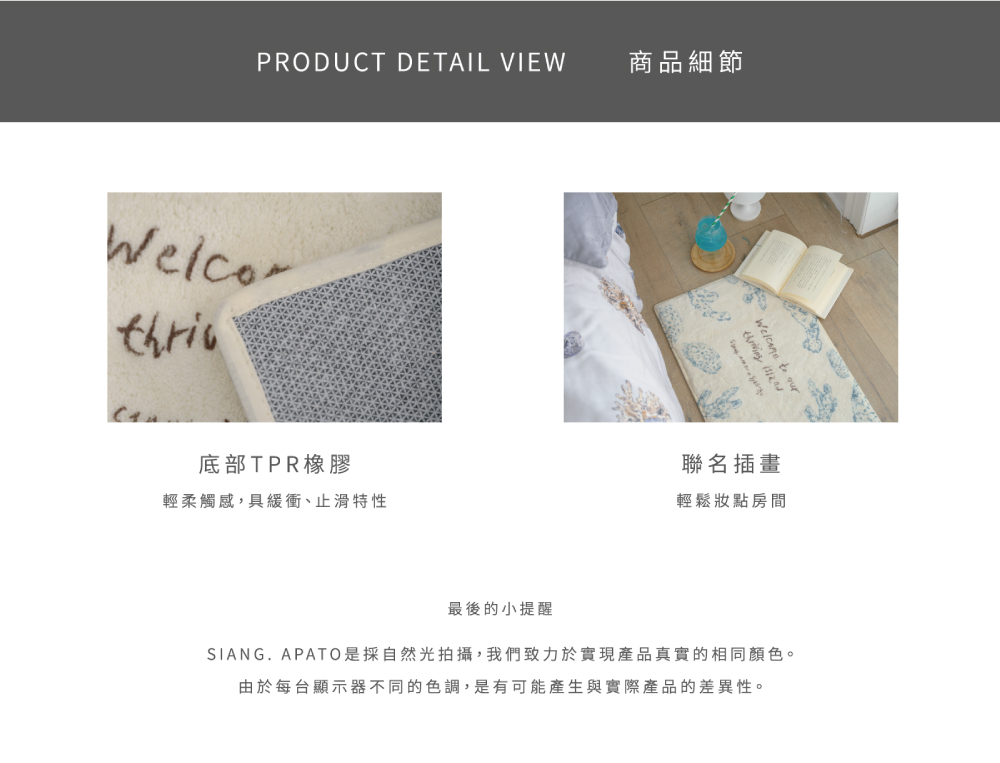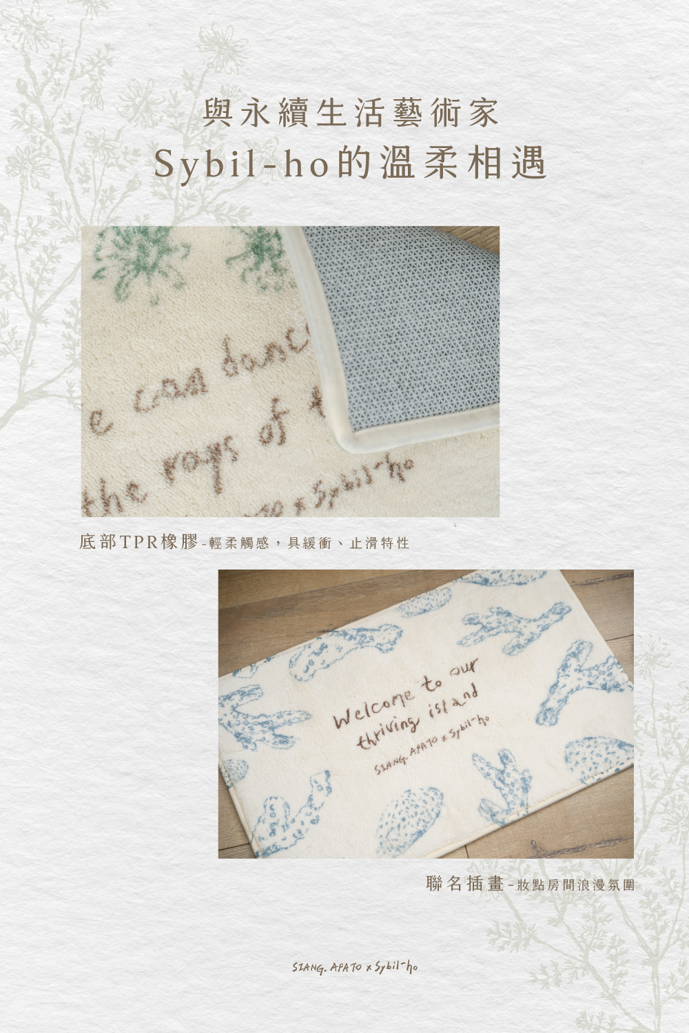 「在陸地與海洋間,我們都能自由自在。」◆Sybil-Ho聯名繪製,氣質柔美◆表面100% 仿生羊絨,柔軟舒適◆底面100% 熱塑性橡膠TPR,防滑不跑位◆ 尺寸:60*40cm