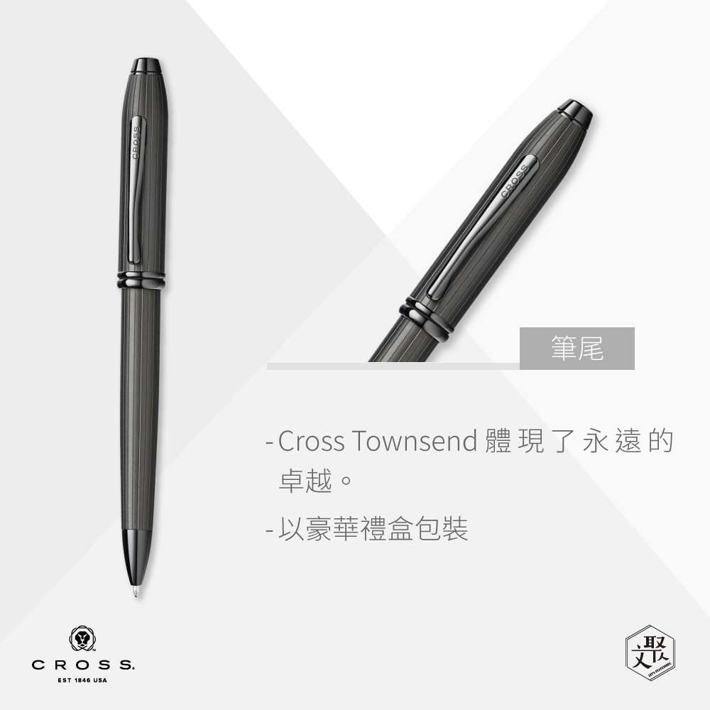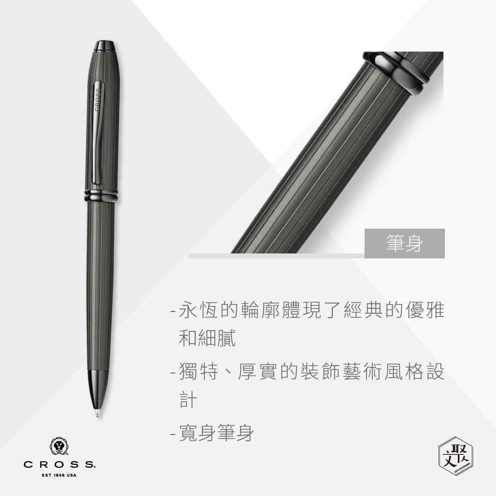 Cross Townsend 體現了永遠的卓越Townsend系列以其傲人的氣勢和絕不妥協的品質而備受青睞永恆的輪廓體現了經典的優雅和細膩獨特、厚實的裝飾藝術風格設計寬身筆身可選擇貴金屬細節以豪華禮盒包裝