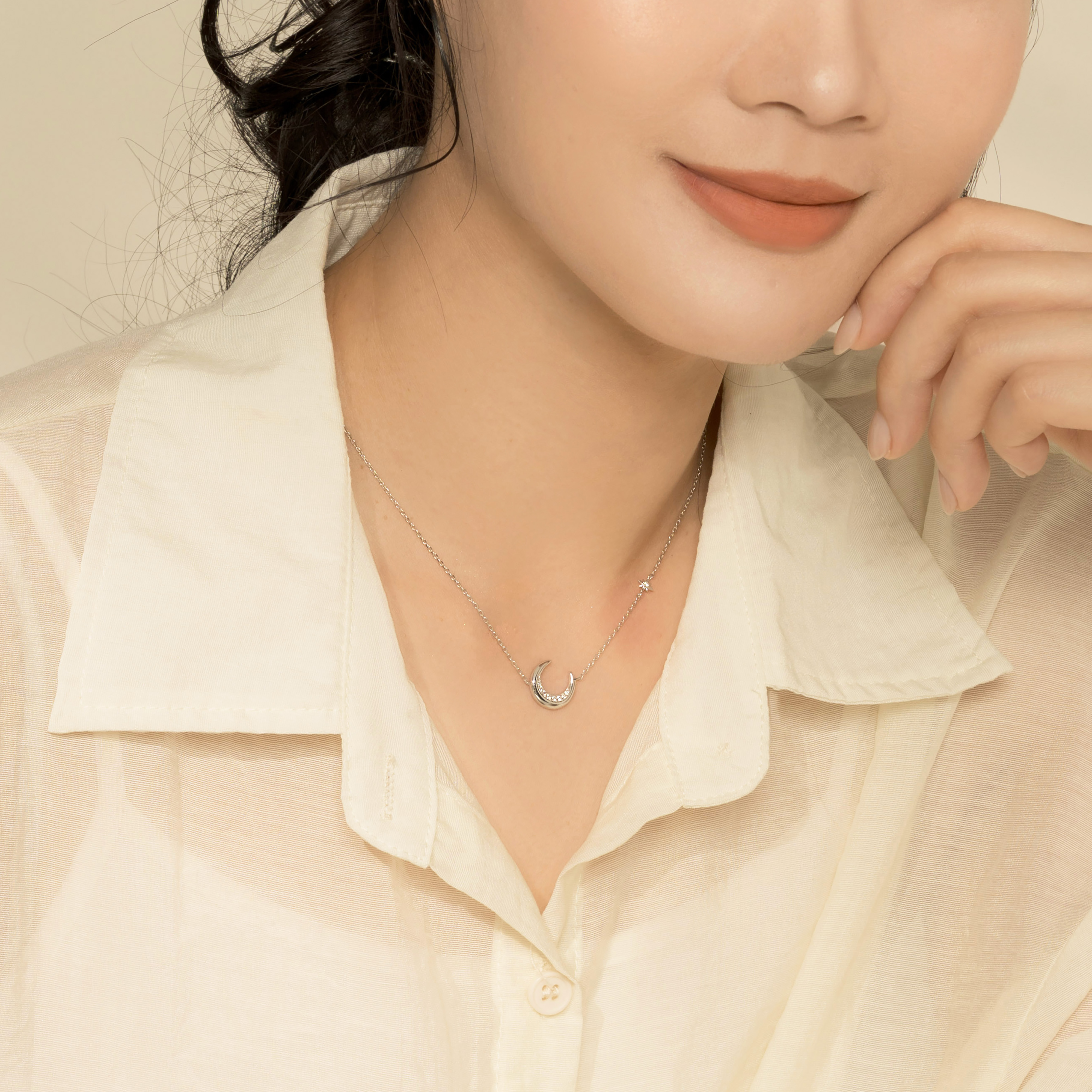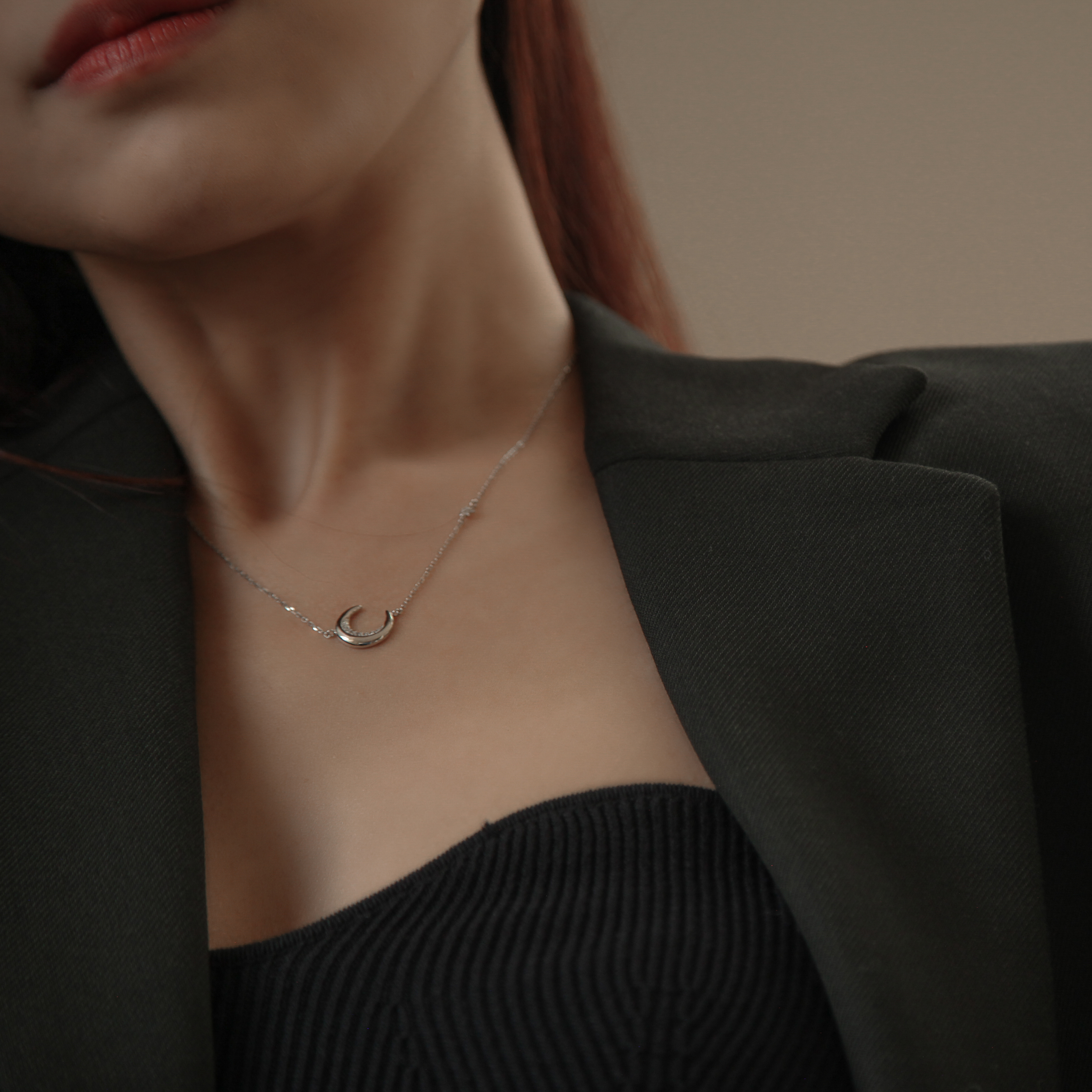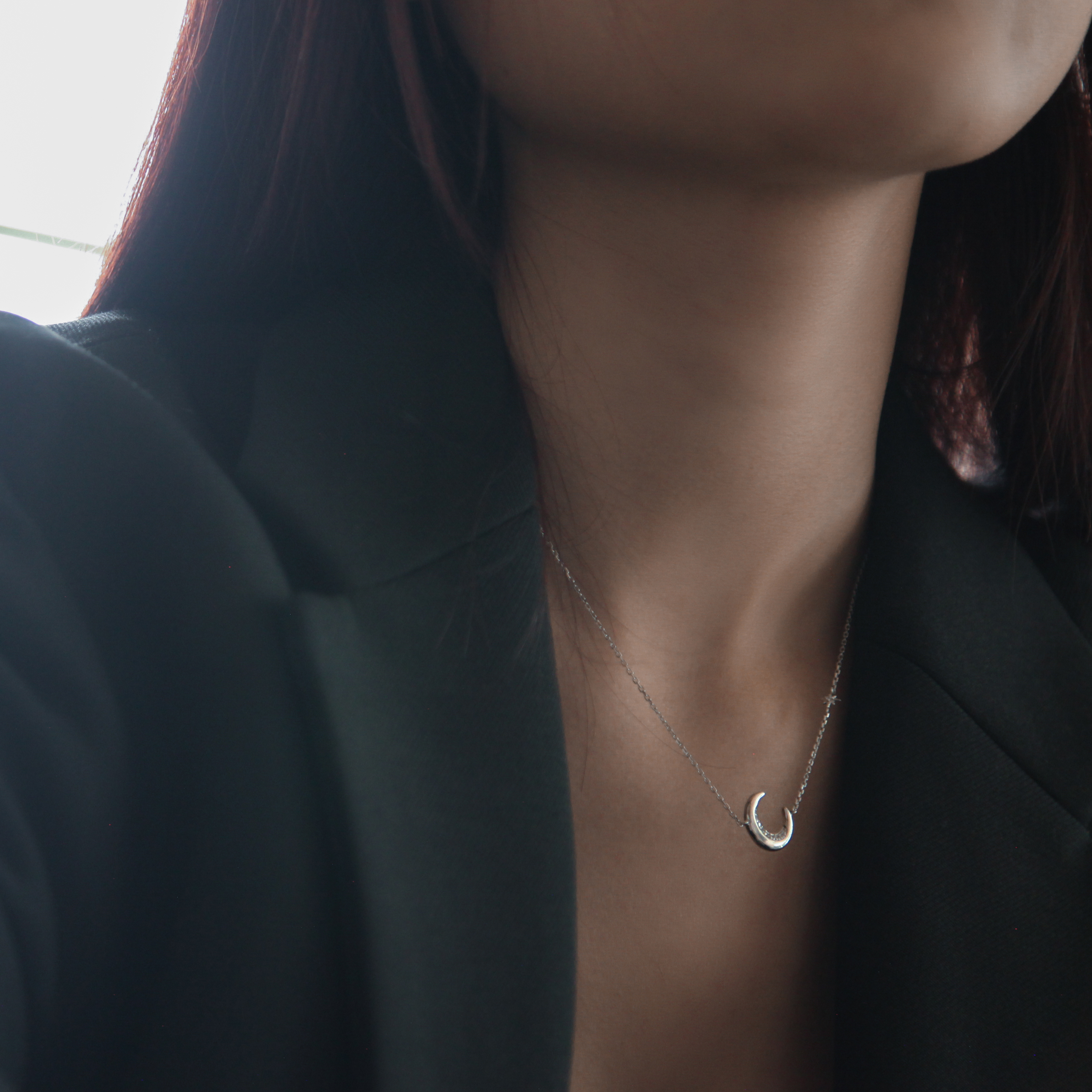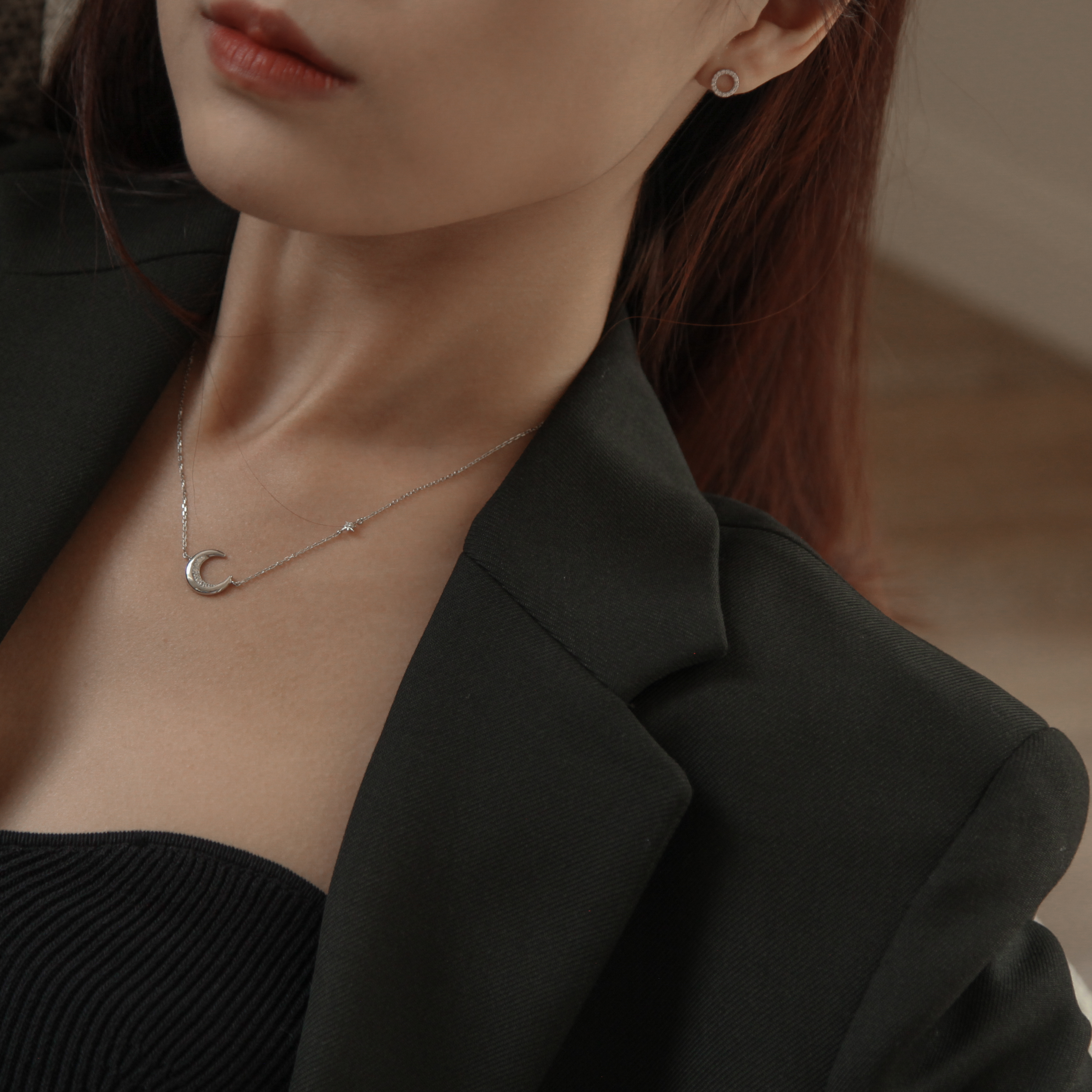 獨家設計 | 特選 3A 鋯石設計靈感取自月亮女神 Artemis將弦月配上一顆星星掛在極簡的純銀練身上在夜空中靜靜發光