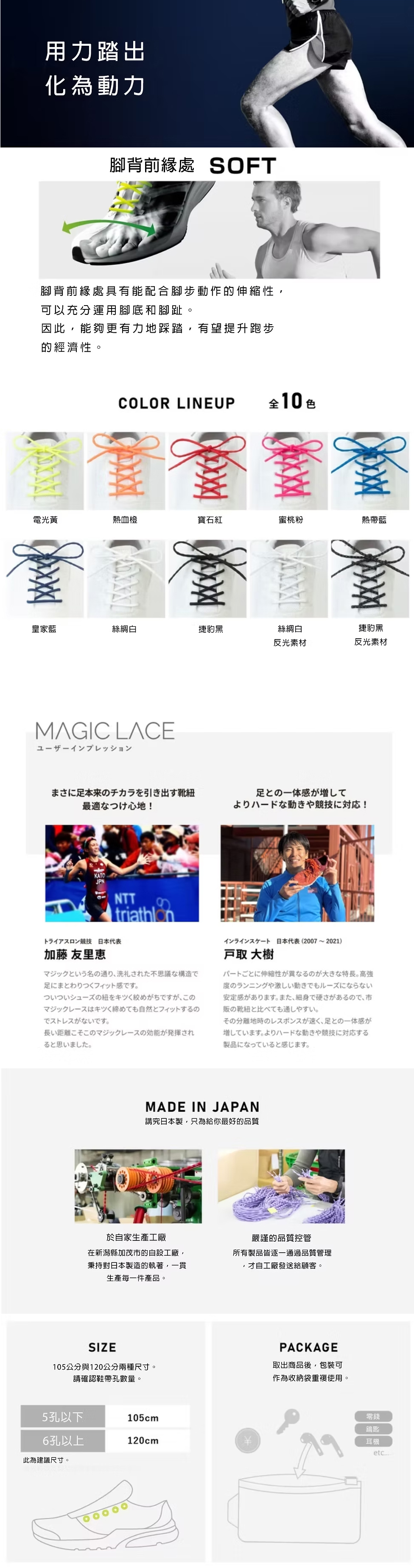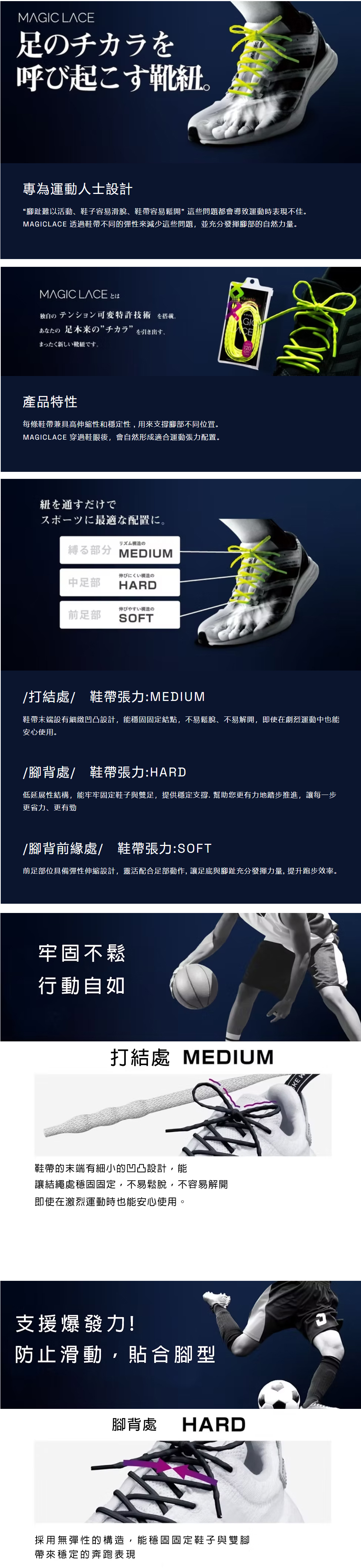 Magic Lace 的核心設計是:一條鞋帶中結合三種不同張力區段,從腳尖到腳踝依序配置,根據腳部活動需求,給予剛剛好的支撐與彈性: