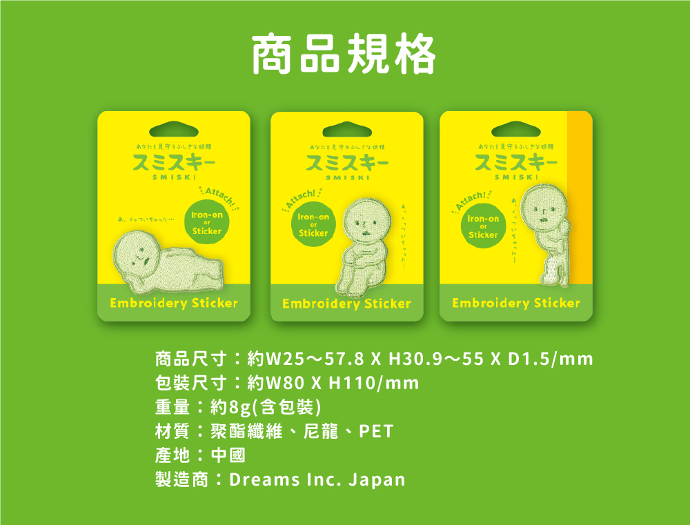 除了可以將他們貼在手機殼後面、電腦螢幕周圍等光滑平面以外還能藉由熨斗加熱等方式,讓他作為燙布貼黏在帆布包、後背包、手帕等布質平面精緻的刺繡造型,完美描繪出SMISKI的招牌表情和動作全套共三款,這次會在哪裡發現可愛的角落精靈呢?