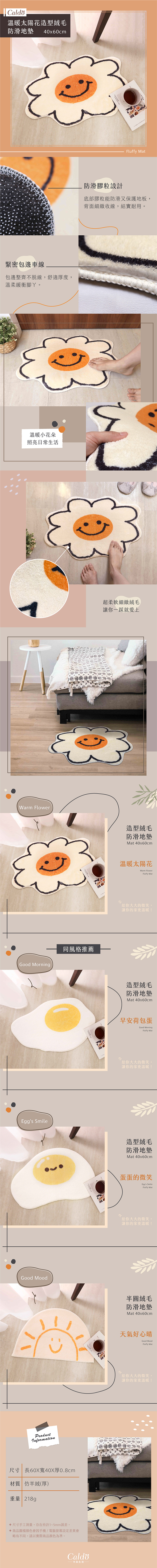 .給你大大的微笑,開啟一天.溫暖小花朵,照亮日常生活.仿羊絨材質,赤腳踩踏舒適.適合擺放於室內各處使用.短毛絨面,親膚不藏灰塵.底部防滑膠粒,保護地板.緊密的包邊車線,結實耐用.可水洗,耐磨且不易掉色