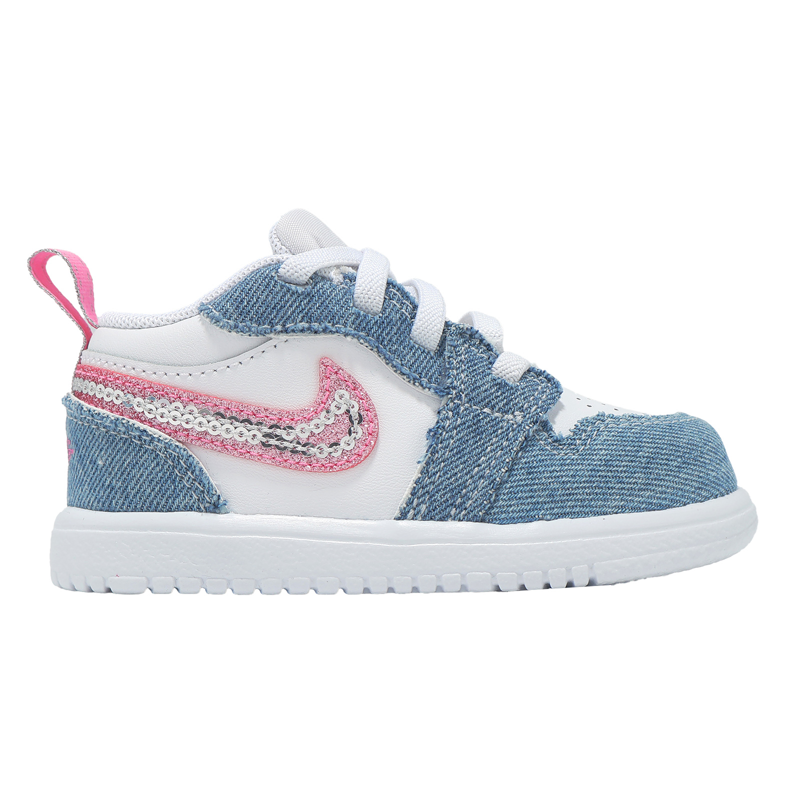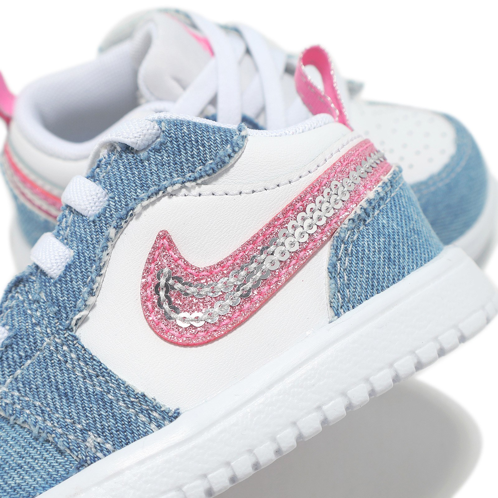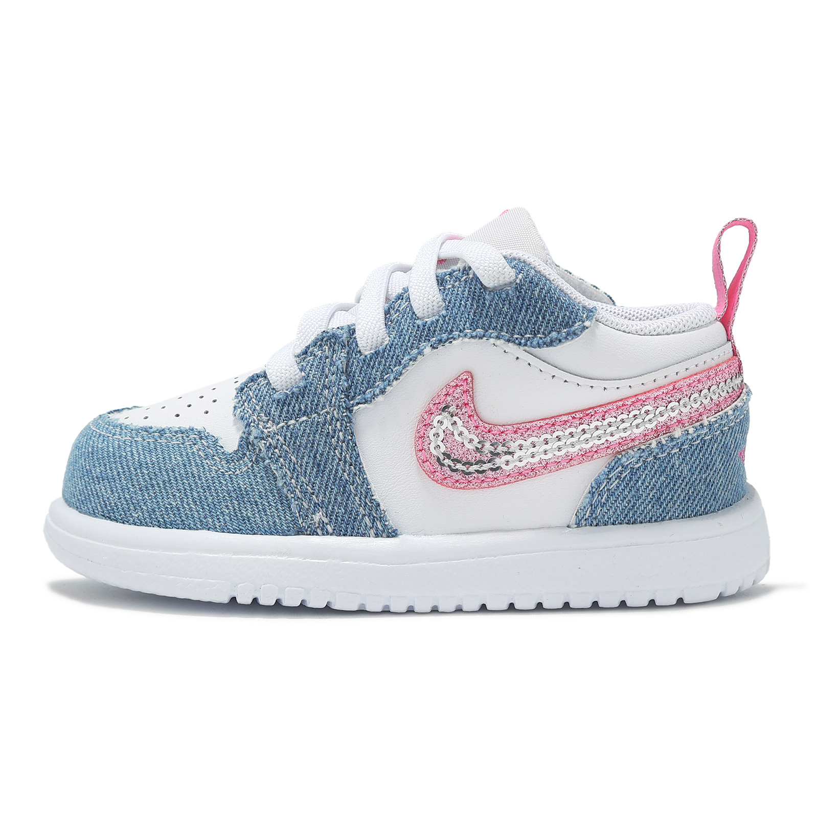 *鞋面以合成皮革與丹寧併接設計,配上鮮豔粉紅色與亮片 Swoosh 標誌,打造適合寶貝的日常玩趣風格。