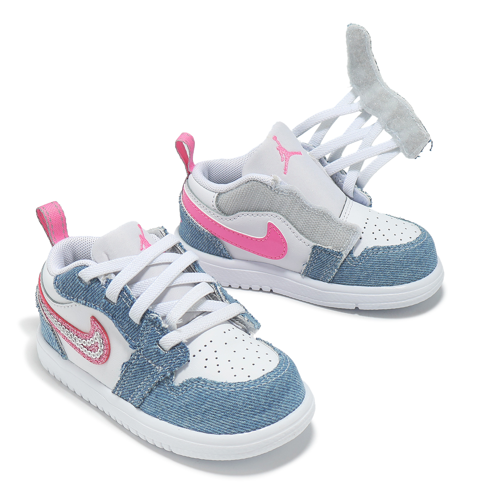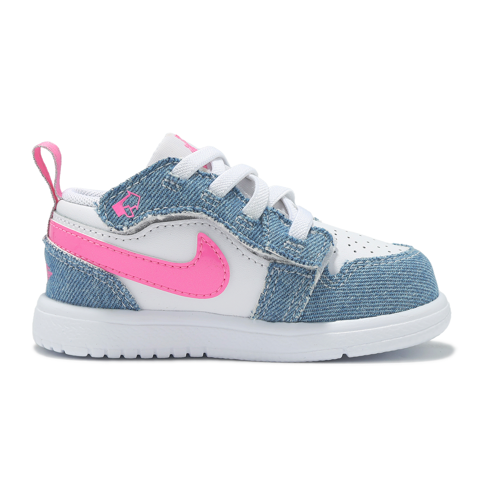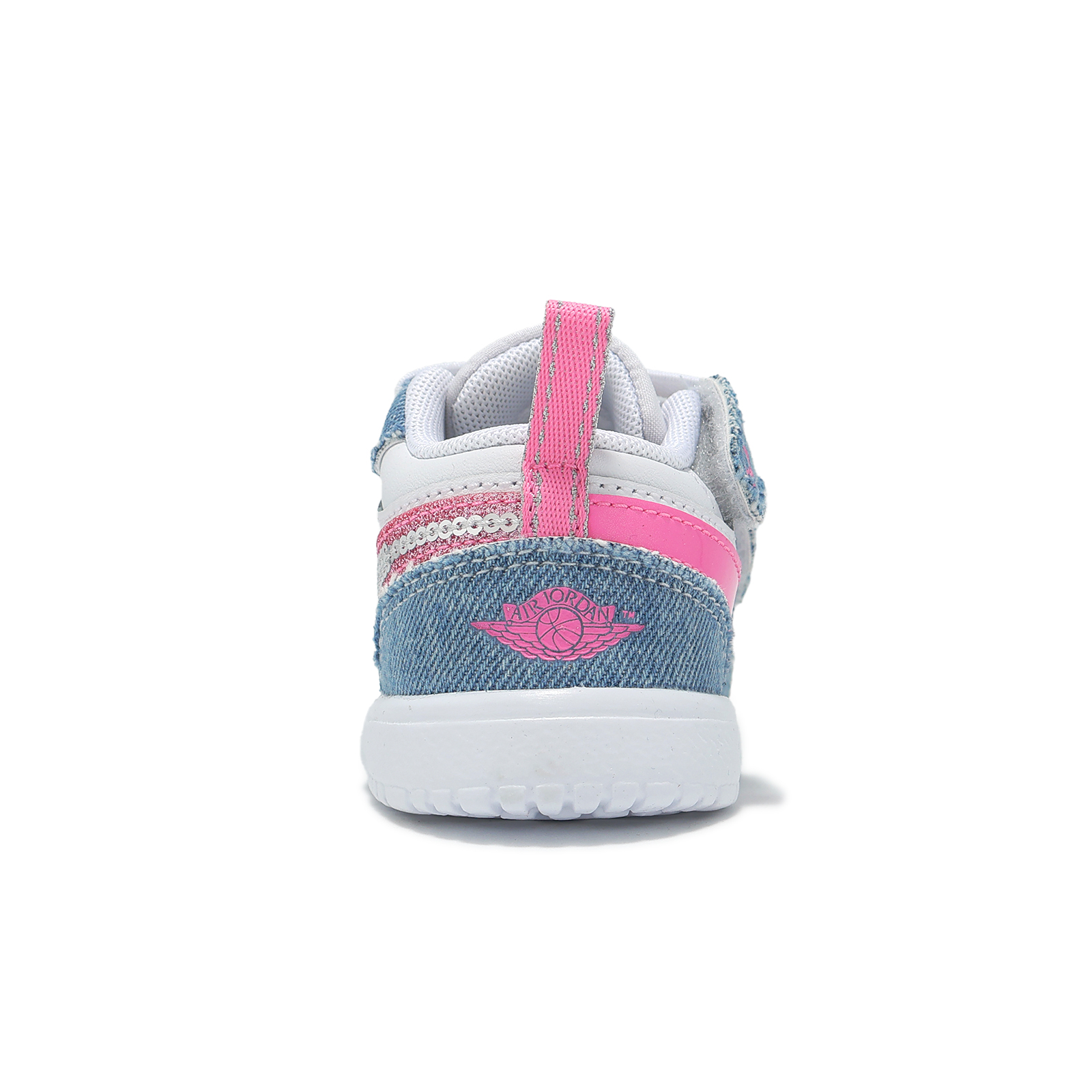 *鞋面以合成皮革與丹寧併接設計,配上鮮豔粉紅色與亮片 Swoosh 標誌,打造適合寶貝的日常玩趣風格。