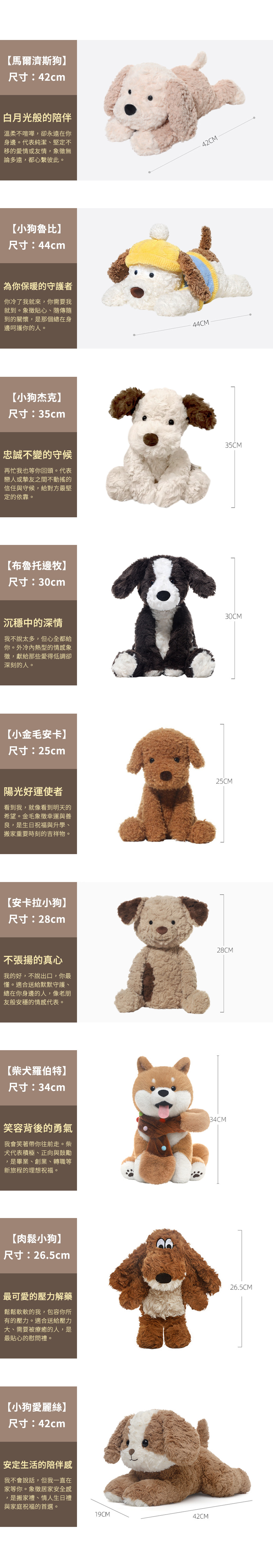 名稱:可愛狗狗系列毛絨玩偶貨號:CP0217產品尺寸:【布魯托邊牧】30cm【小金毛安卡】25cm【小狗魯比】44cm 【馬爾濟斯狗】42cm【小狗杰克】35cm產品材質:【表面】長毛絨【填充】柔軟PP棉