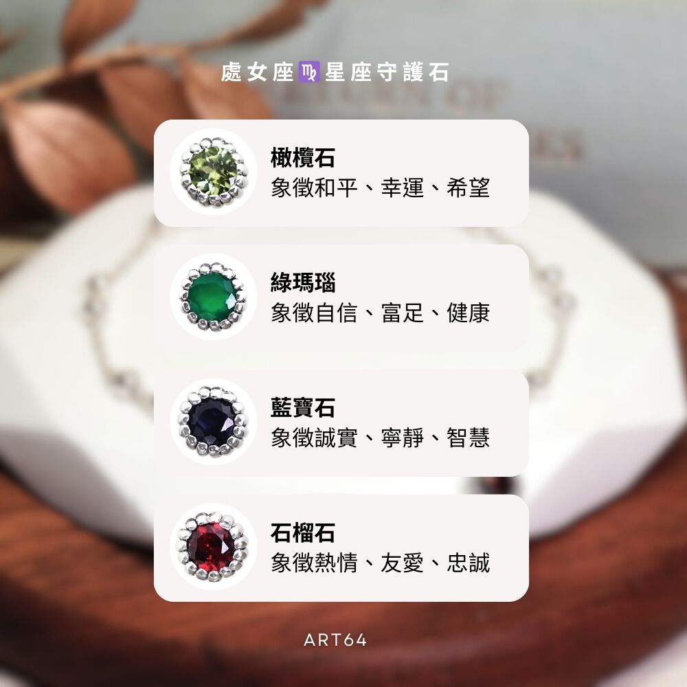 可依照喜好任選一款處女座守護石:橄欖石、綠瑪瑙、石榴石、藍寶石