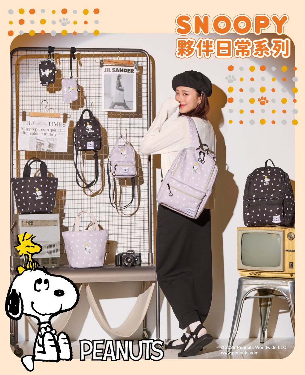 史努比夥伴日常系列休閒包款新登場! 以SNOOPY字母結合史努比與胡士托的溫暖互動圖樣,打造趣味與實用兼具的風格配件,將經典童趣化為日常時尚!