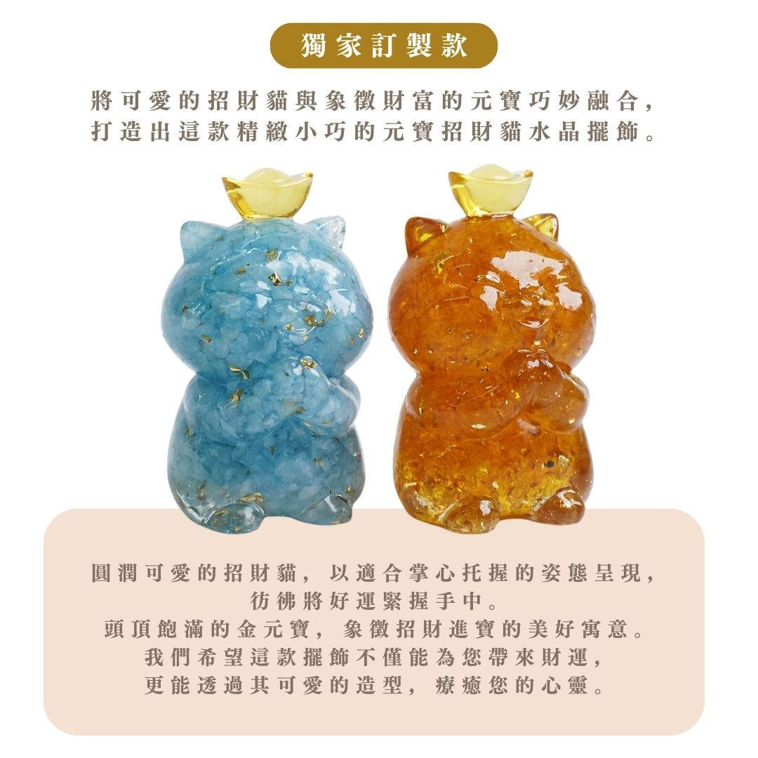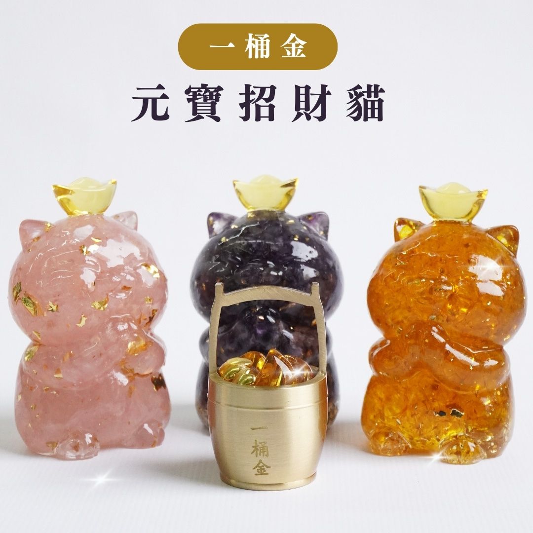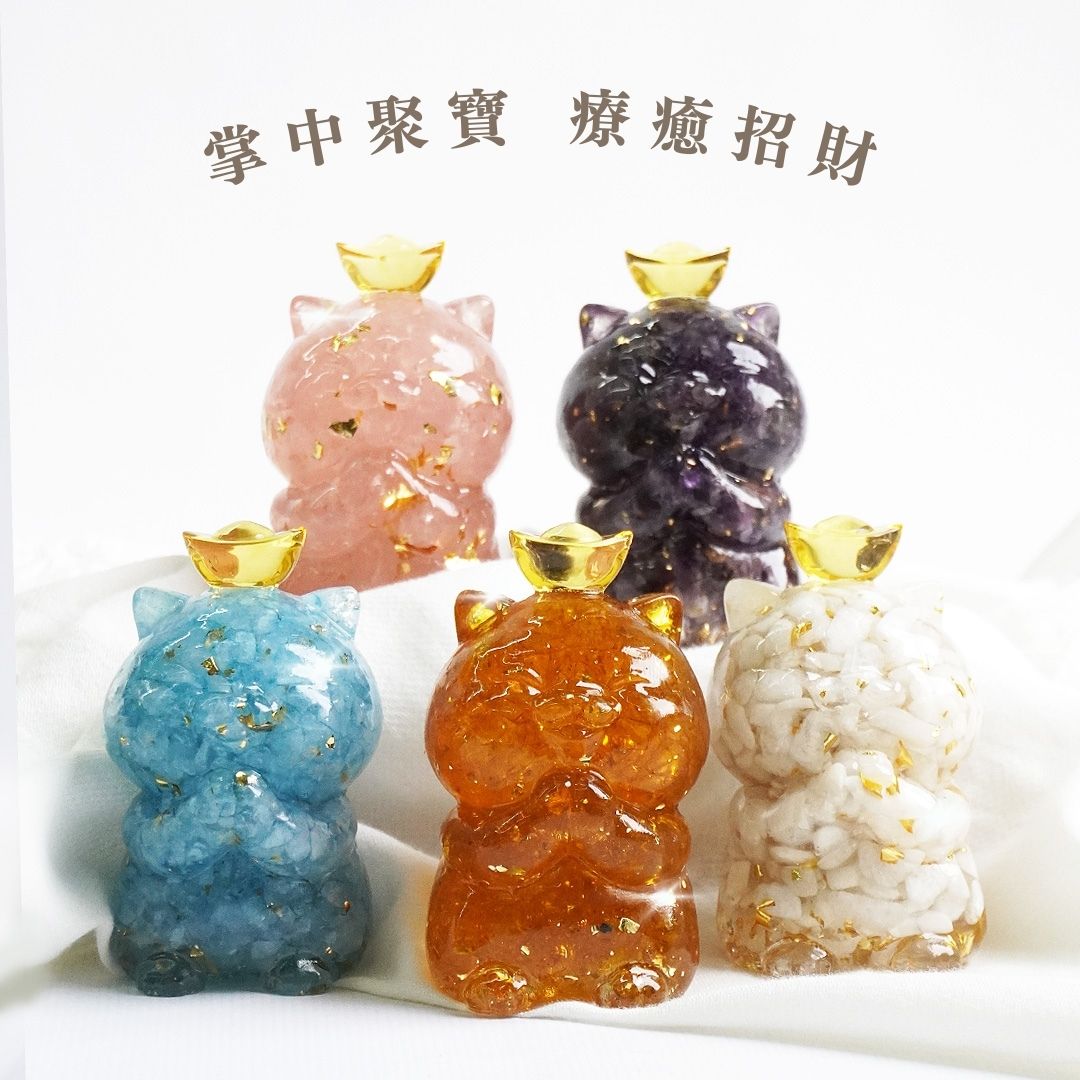Hourrae 荷萊 招財 事業 金箔水晶 元寶招財貓 天然水晶 水晶碎石 滴膠 粉水晶 紫水晶 海藍寶 黃水晶 一桶金