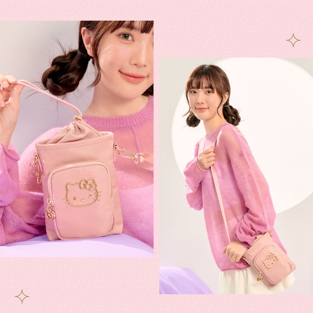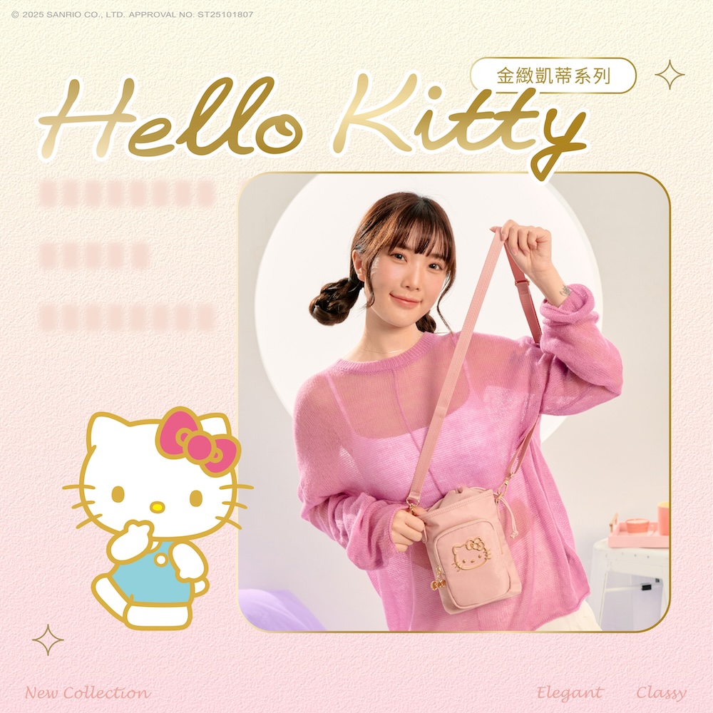 金緻凱蒂女包系列閃耀登場! 以典藏黑|夢幻粉微光澤面料,描繪KITTY輪廓,綴上華麗的金色系凱蒂,打造迷人的精緻日常穿搭配件,每款都想擁有!
