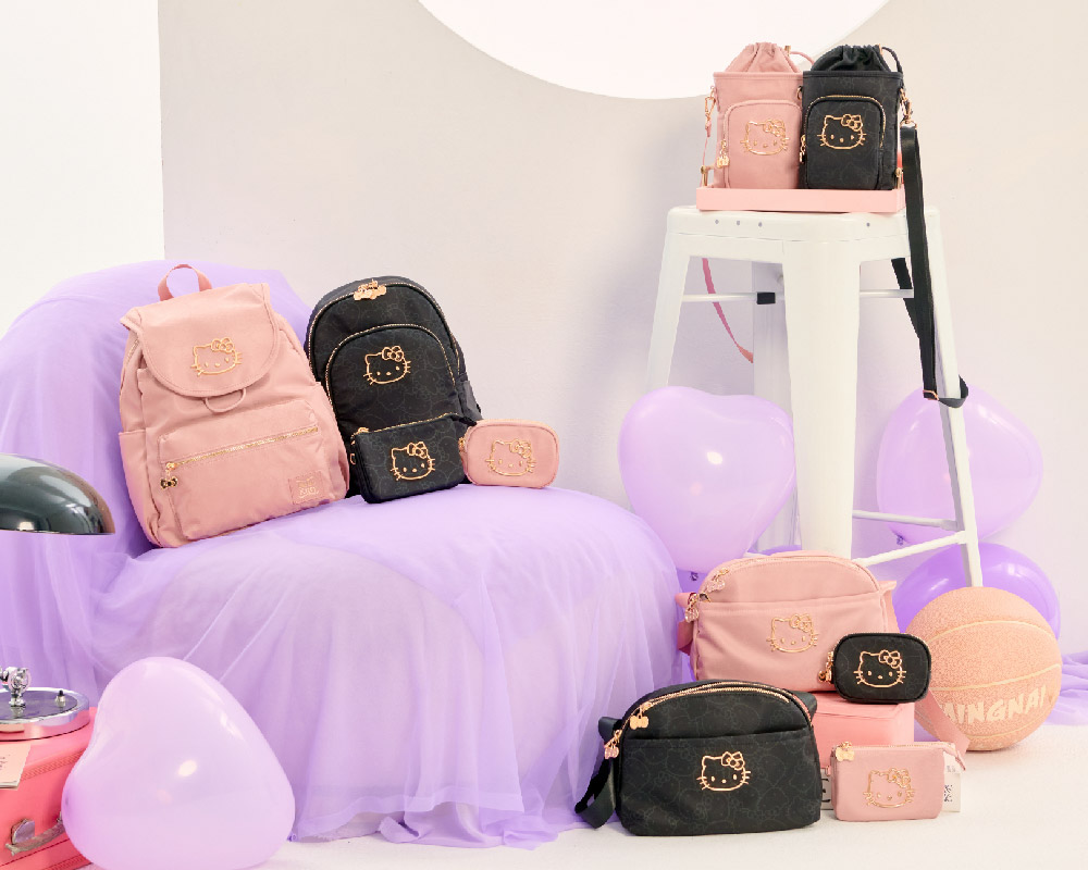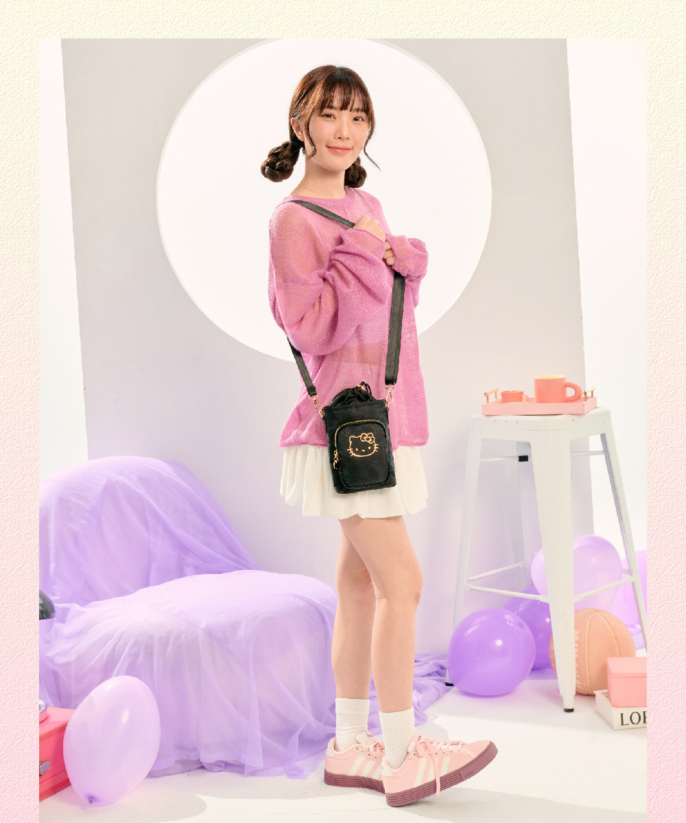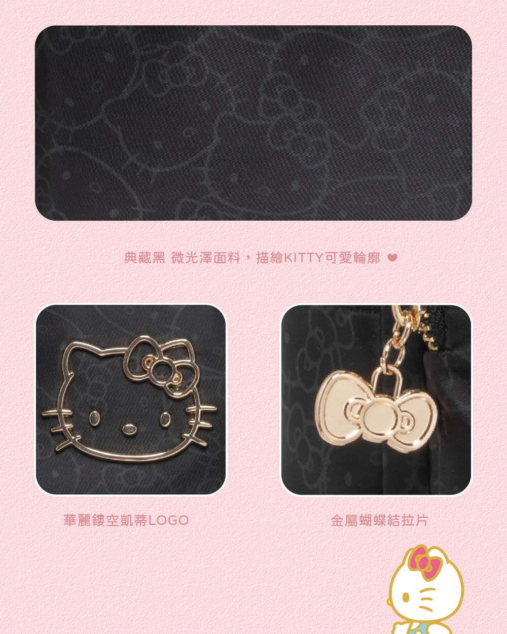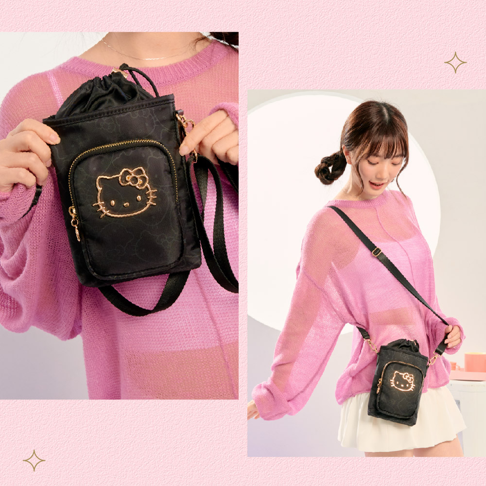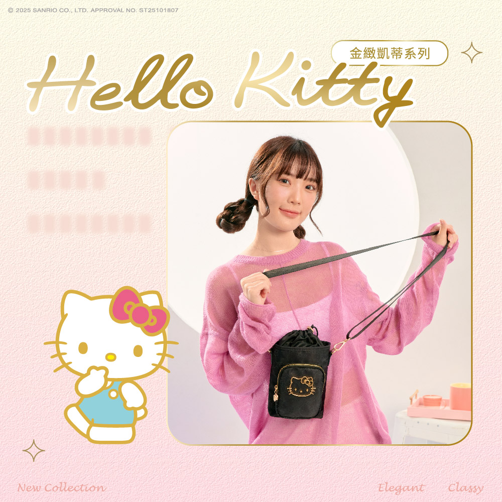 金緻凱蒂女包系列閃耀登場! 以典藏黑|夢幻粉微光澤面料,描繪KITTY輪廓,綴上華麗的金色系凱蒂,打造迷人的精緻日常穿搭配件,每款都想擁有!