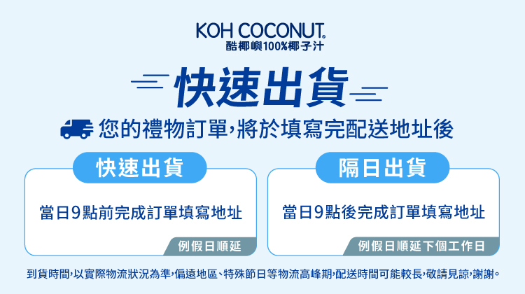 完成付款後會儘速使用本公司配合的物流寄出,出貨時間約需2-3個工作天(不含例假日),實際配送時間依物流公司為主。