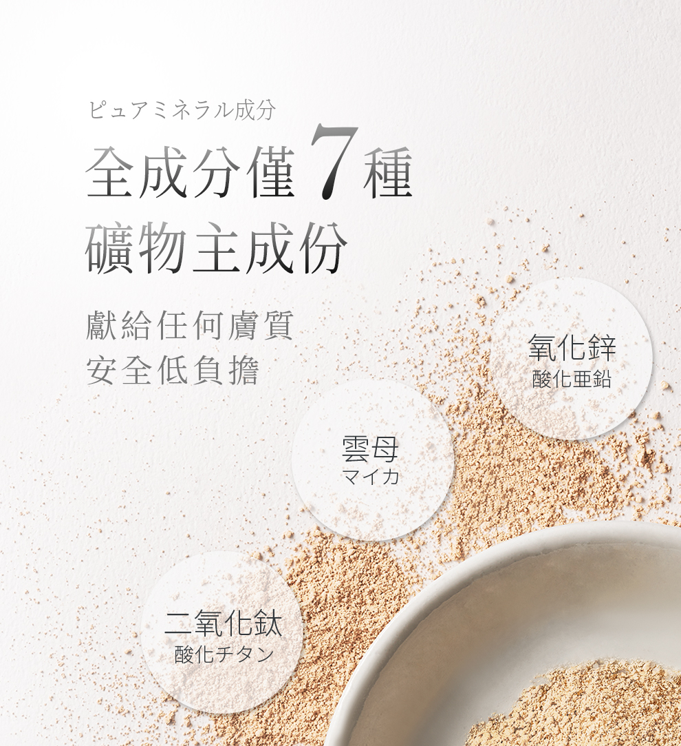 全成分:雲母、氧化鋅、二氧化鈦、矽石、氧化鐵、月桂醯賴氨酸、氫氧化鋁